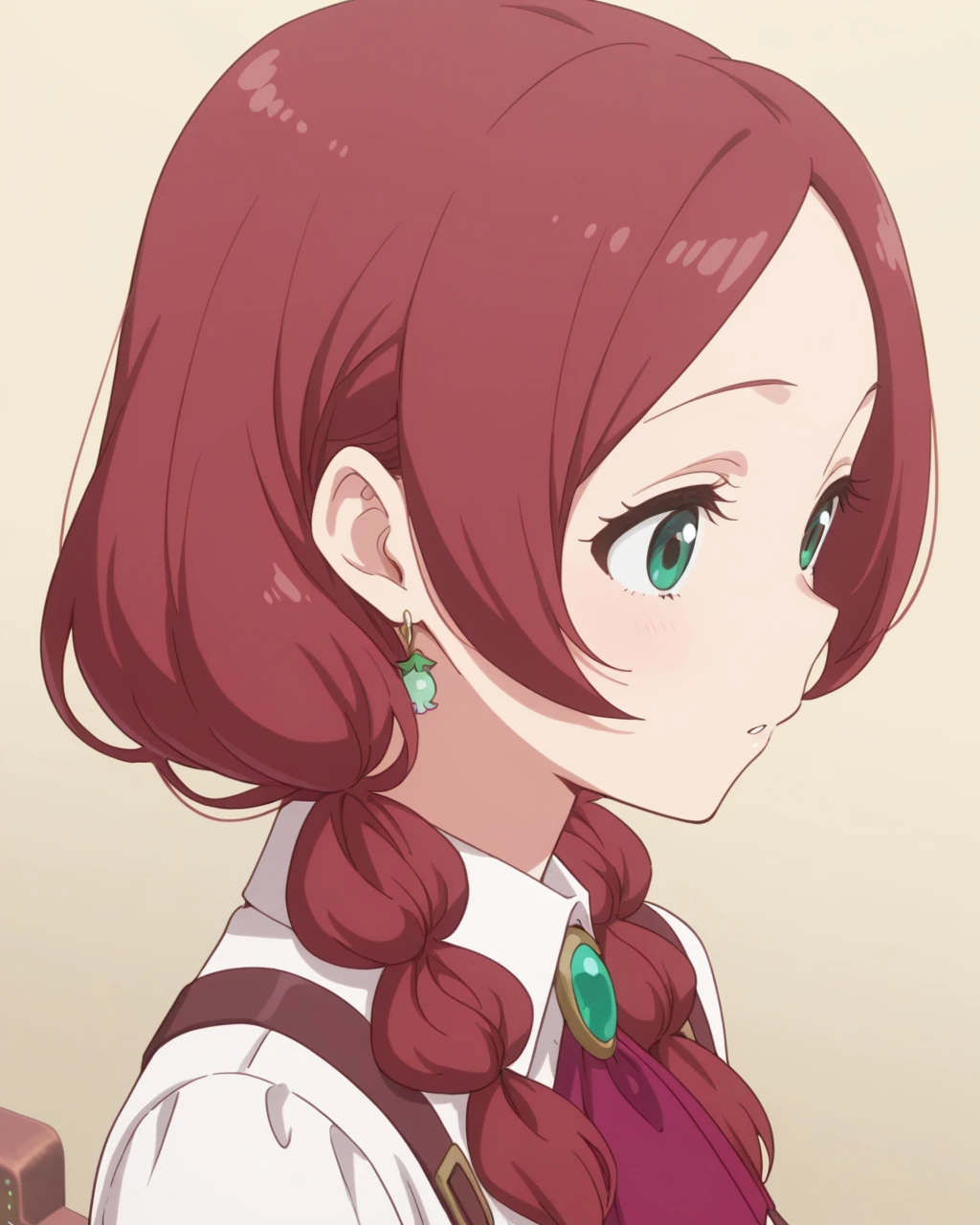 Kirshell, green eyes, reddish-brown hair, braid, twin braids, 1girl, solo