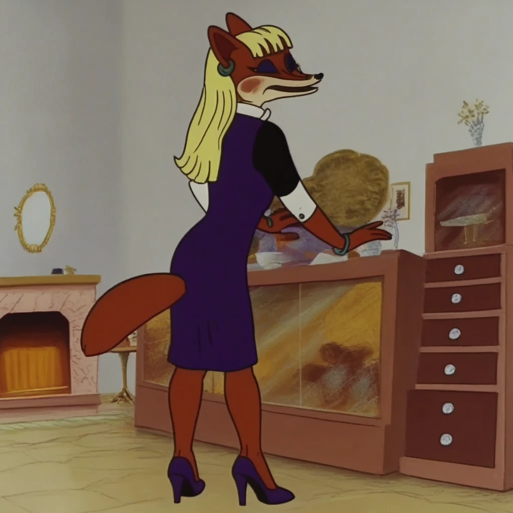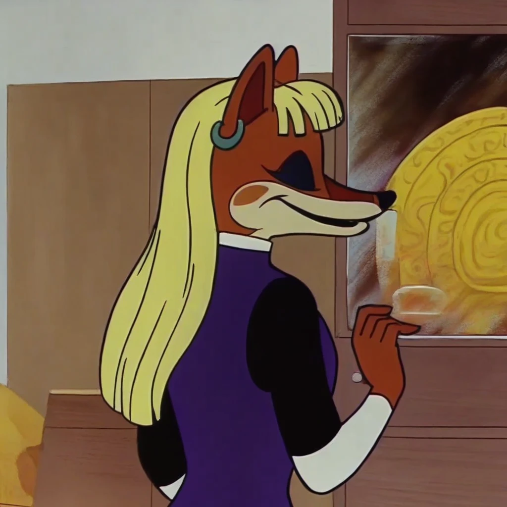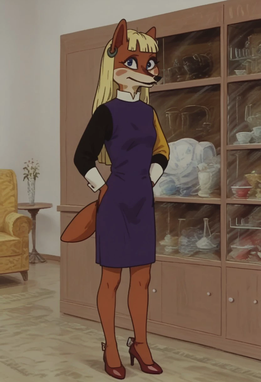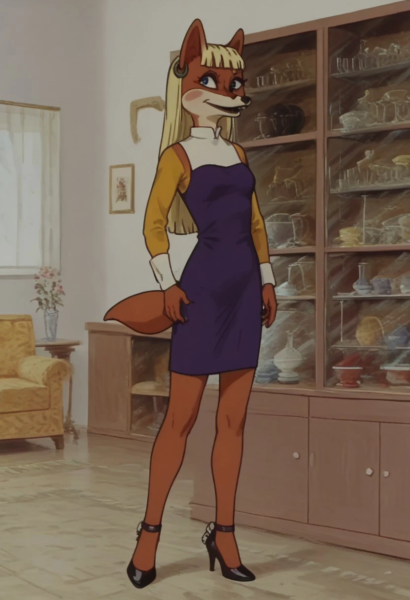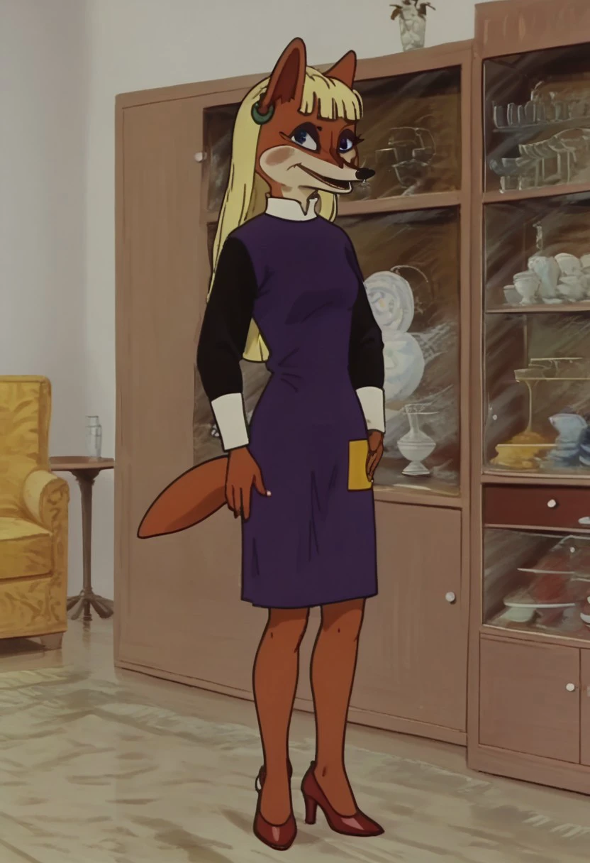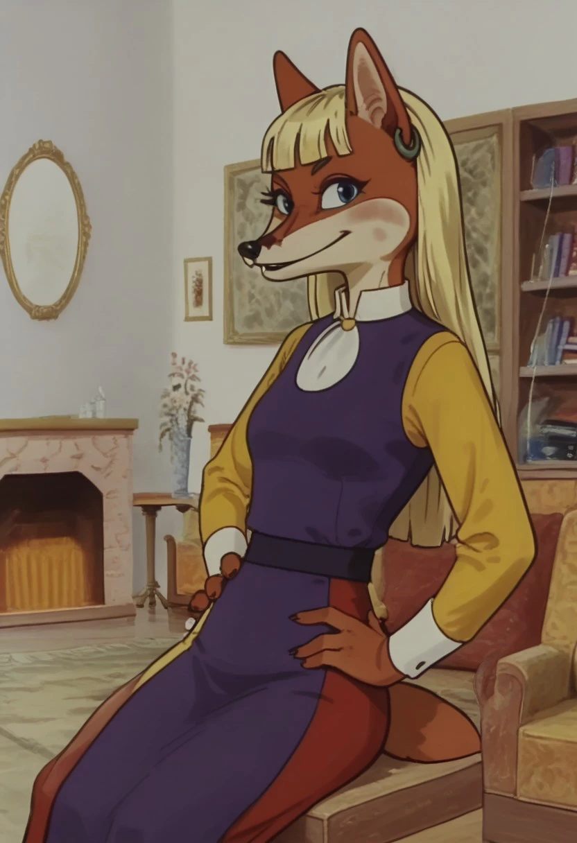 solo focus, 1girl, furry, anthro, female, fox, earrings, long blonde hair, straight hair, bangs, fox ears, fox tail, red fur,