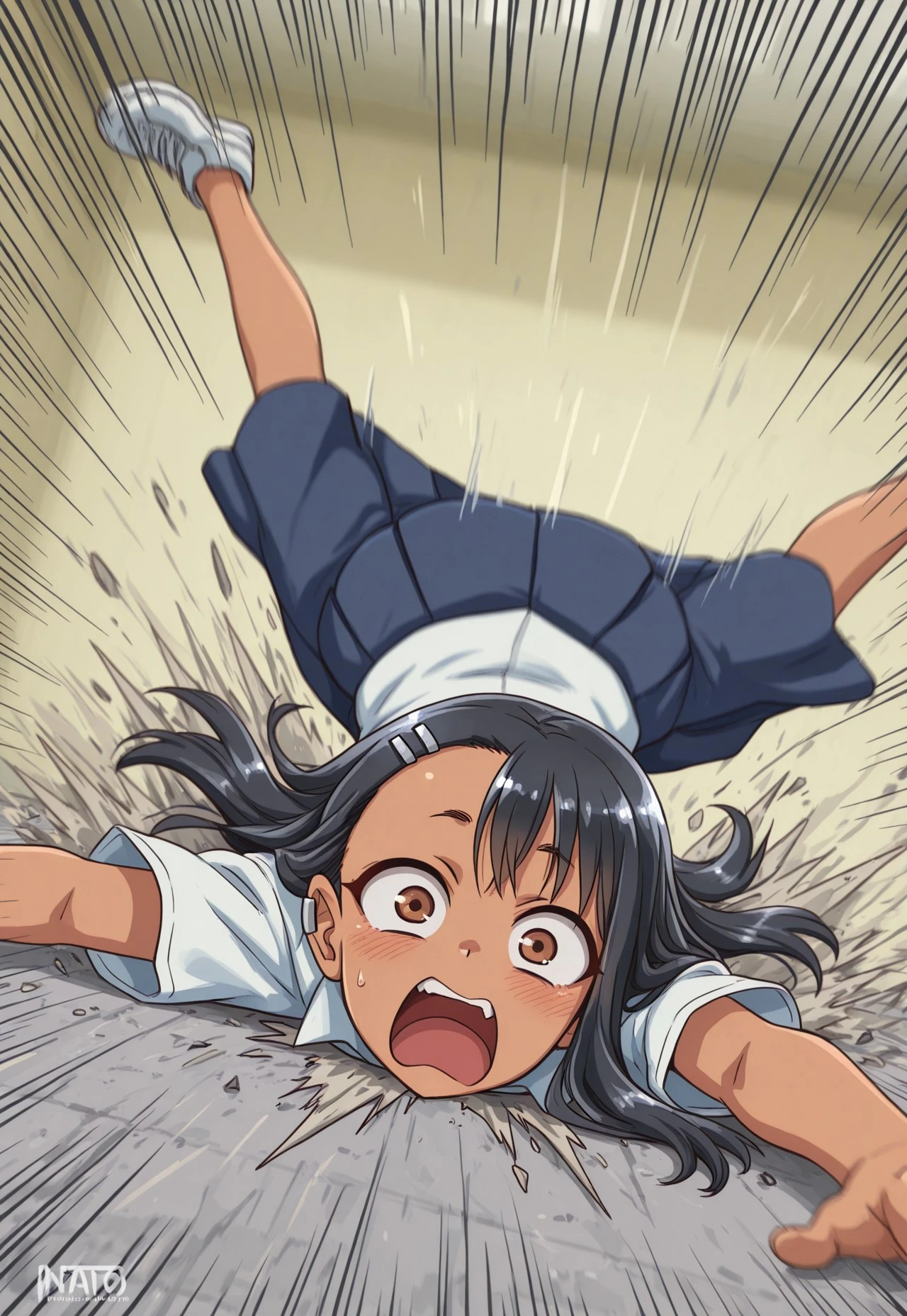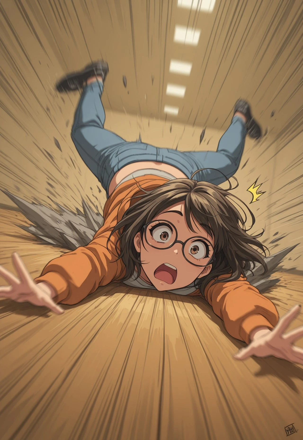 comedic fall, pratfall, faceplant, dynamic pose, action lines,