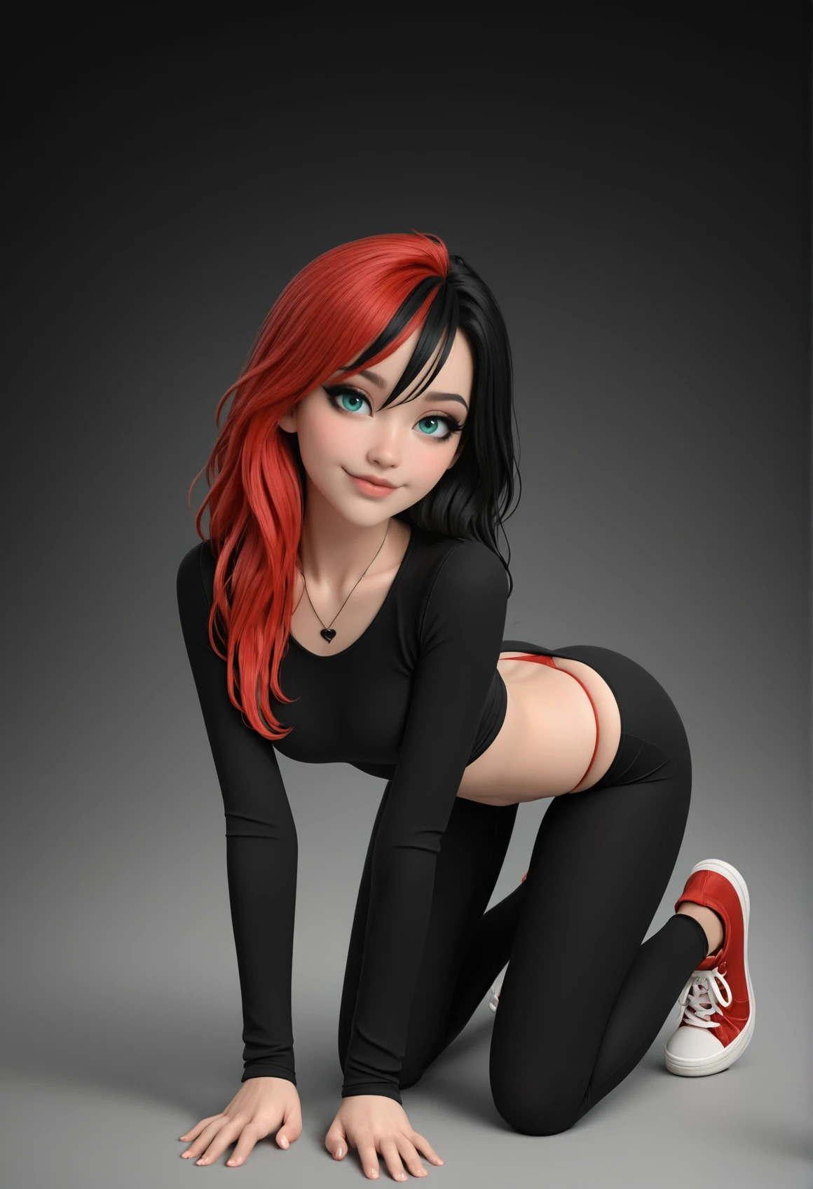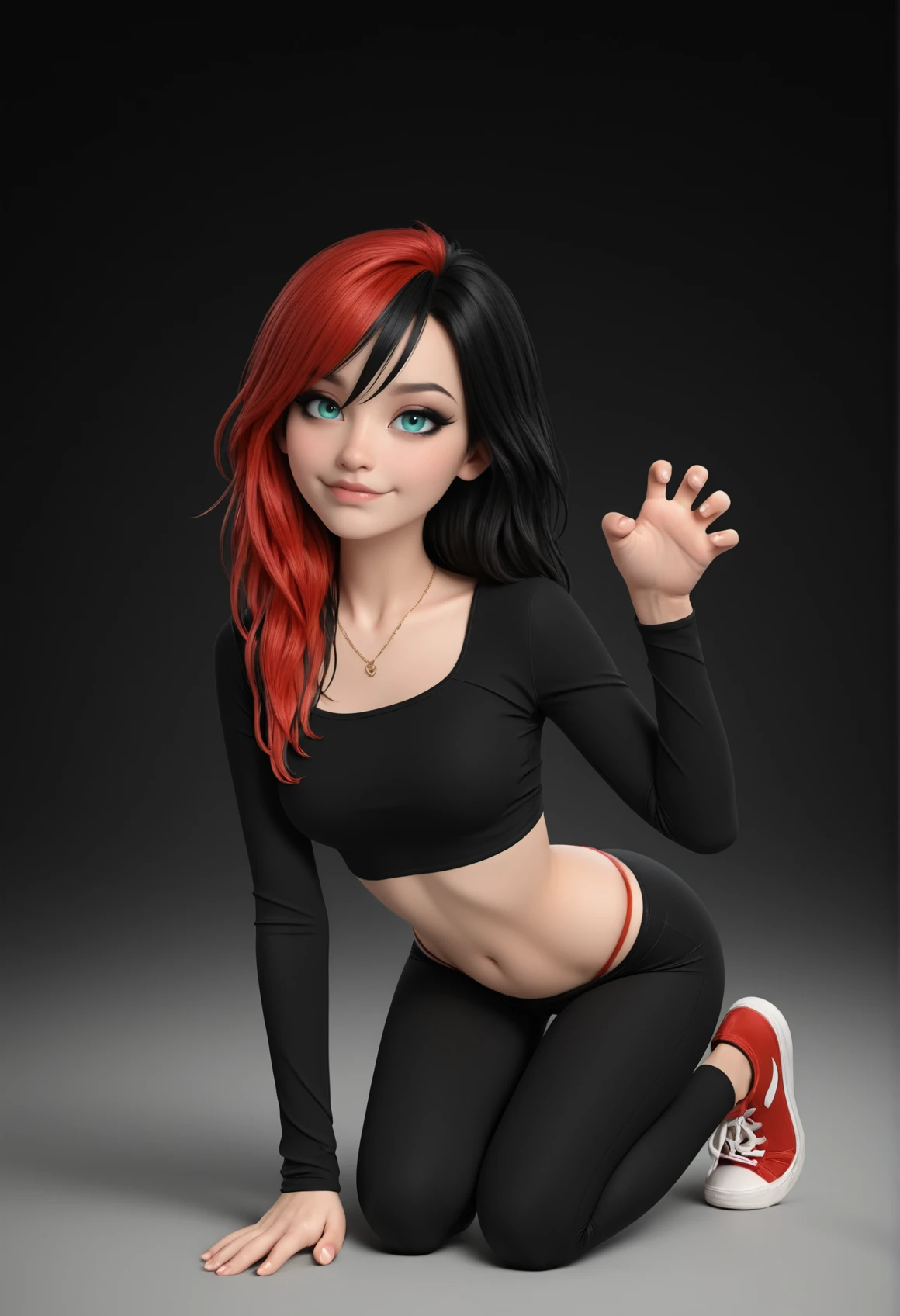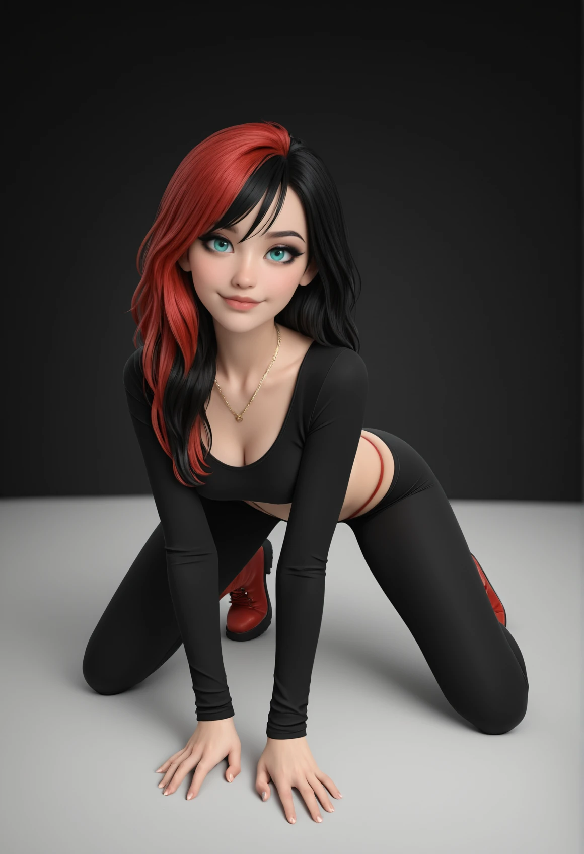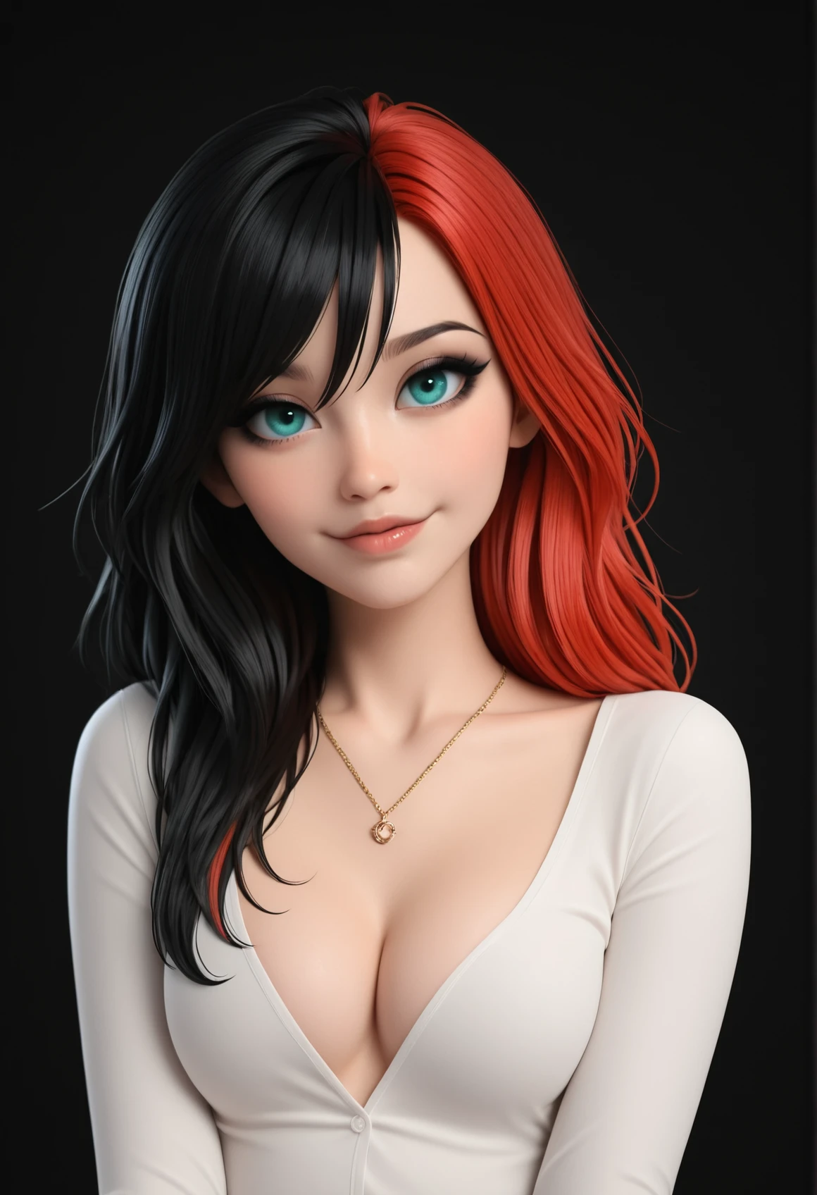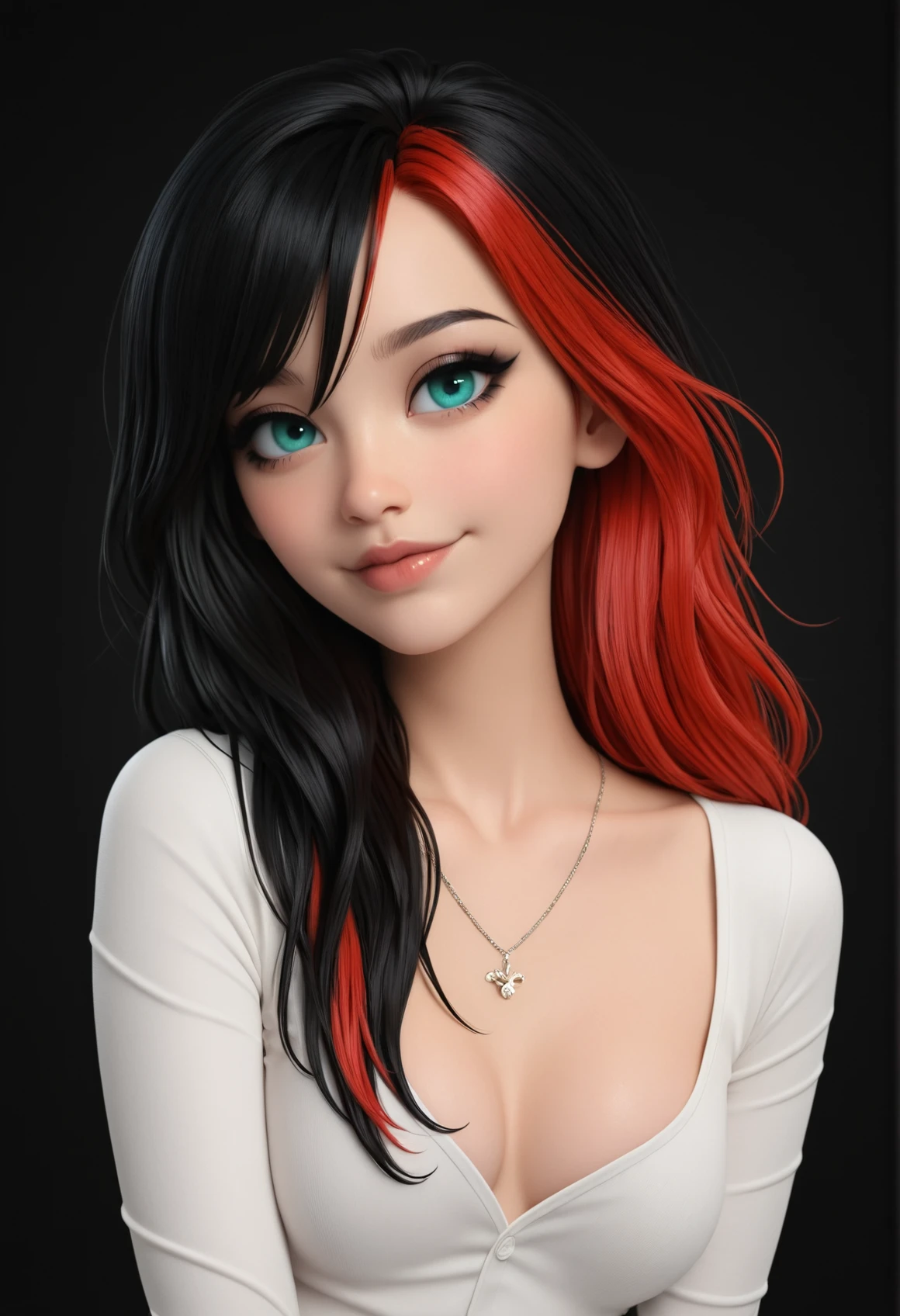 4mberCute, red hair, black hair, long hair, split-color hair, turquoise eyes,