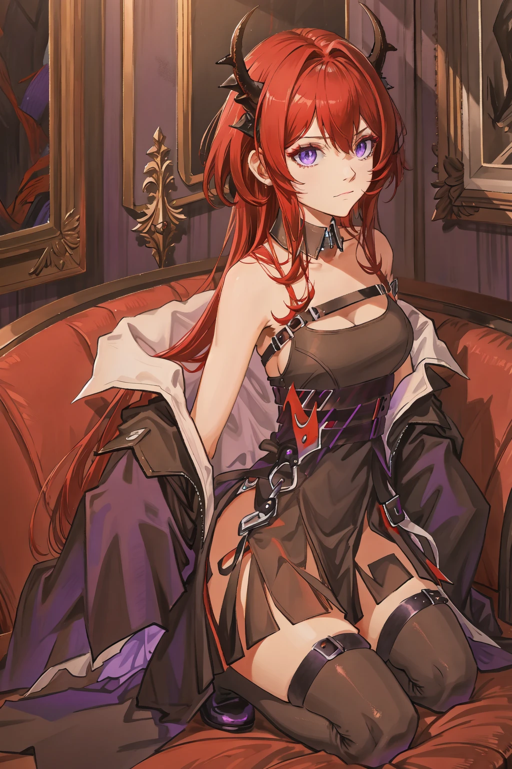 surtr \\\(arknights\\\),surtr \(arknights\),horns,purple eyes,red hair,long hair,bare shoulders,bangs,dress,black dress,hair between eyes,chest strap,demon horns,off shoulder,thighhighs,black thighhighs,detached collar