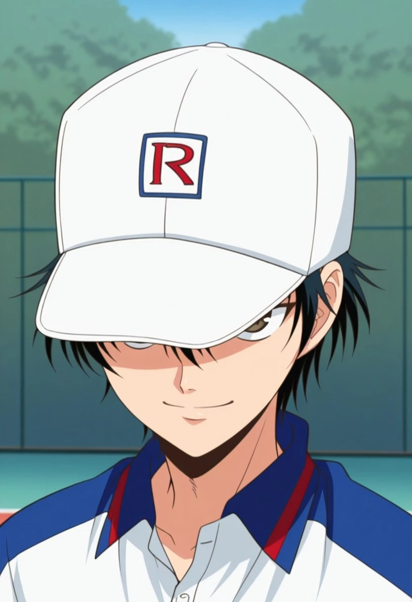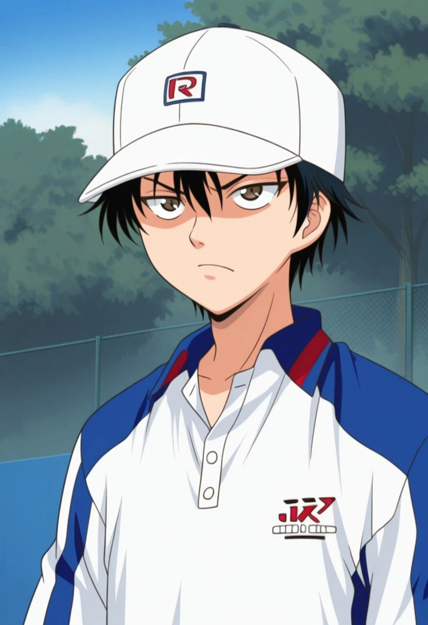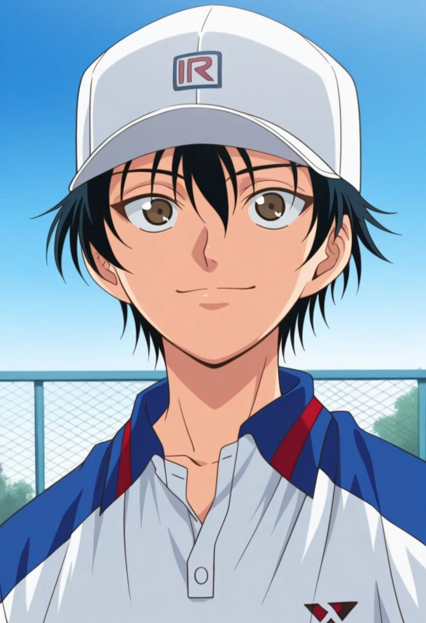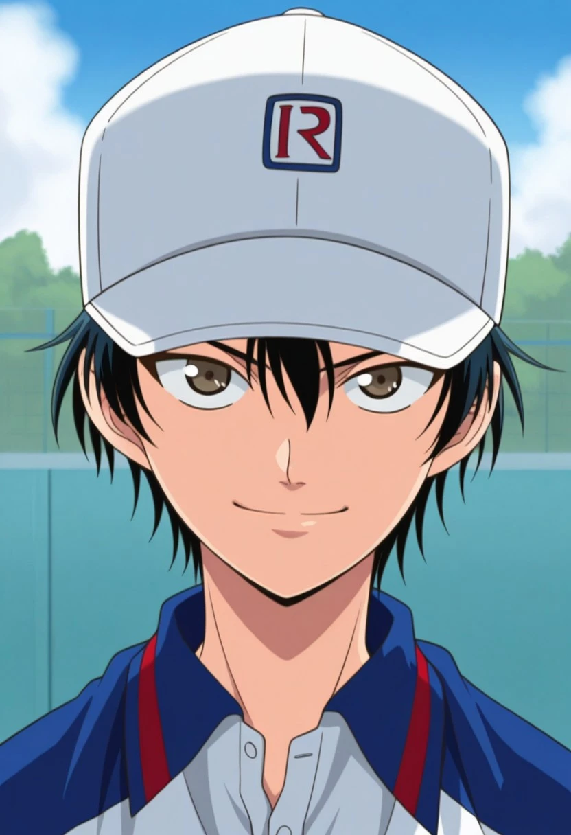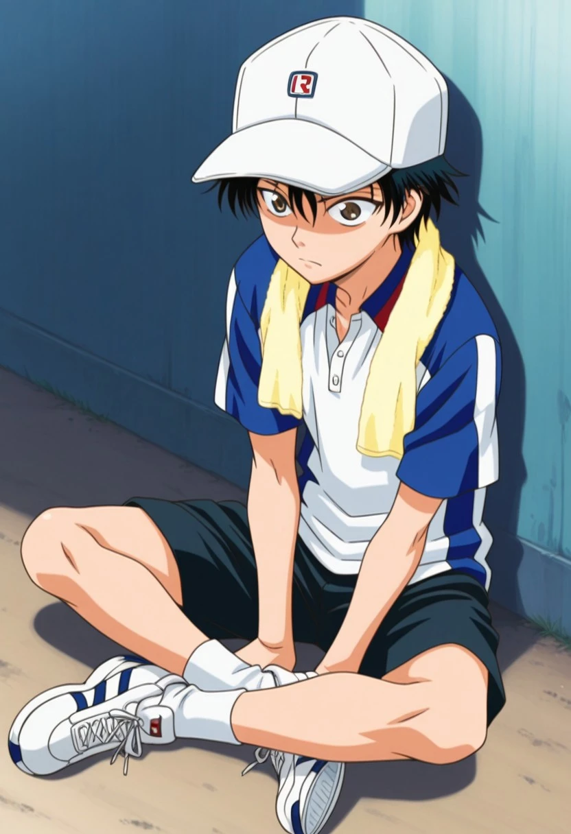 RyomaEchizen, 1boy, male focus, solo, black hair, short hair, hat, baseball cap, white headwear, brown eyes, tennis uniform, polo shirt, white and blue shirt, short sleeves, raglan sleeves, shorts, black shorts, socks, white socks, shoes, sneakers,