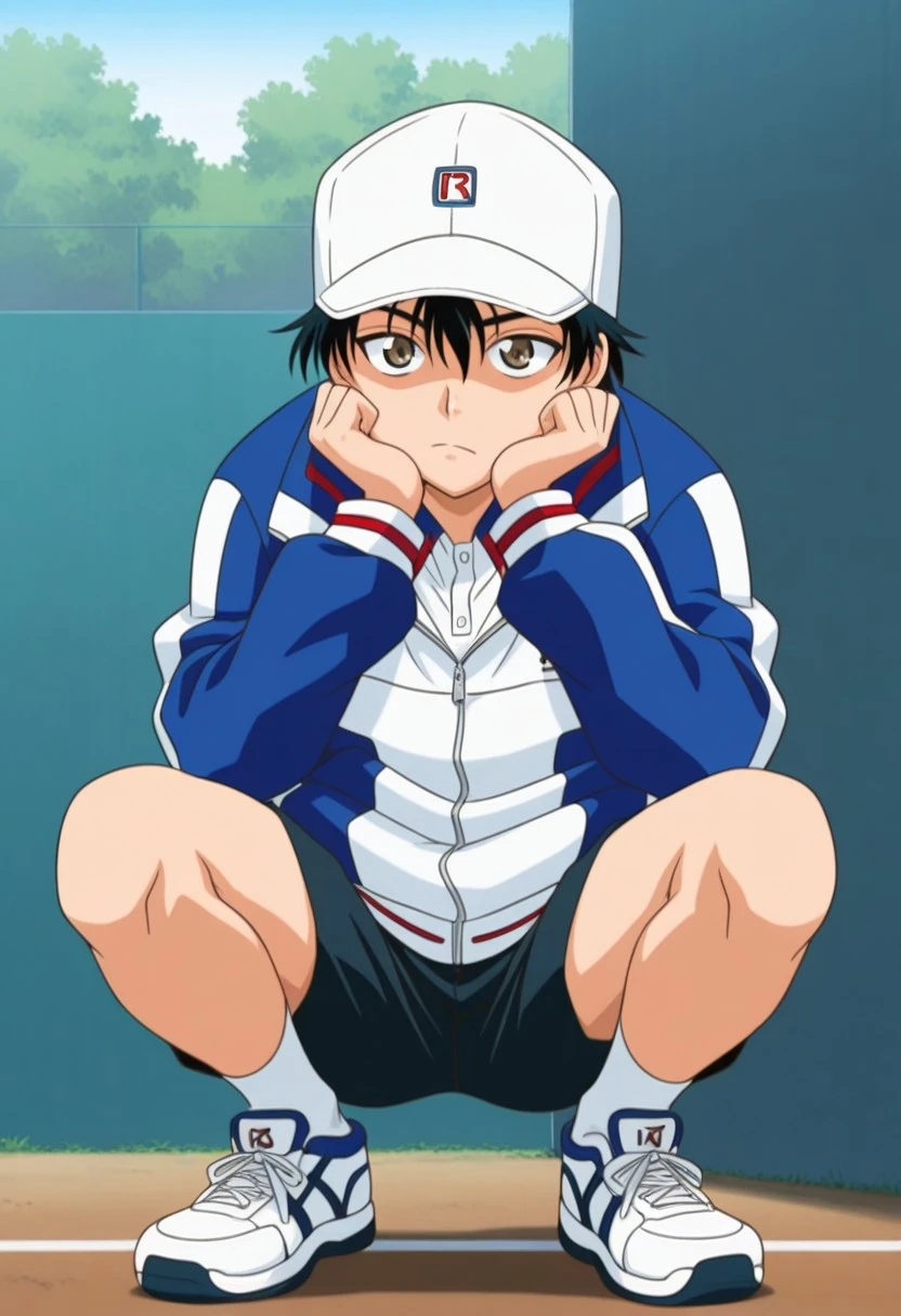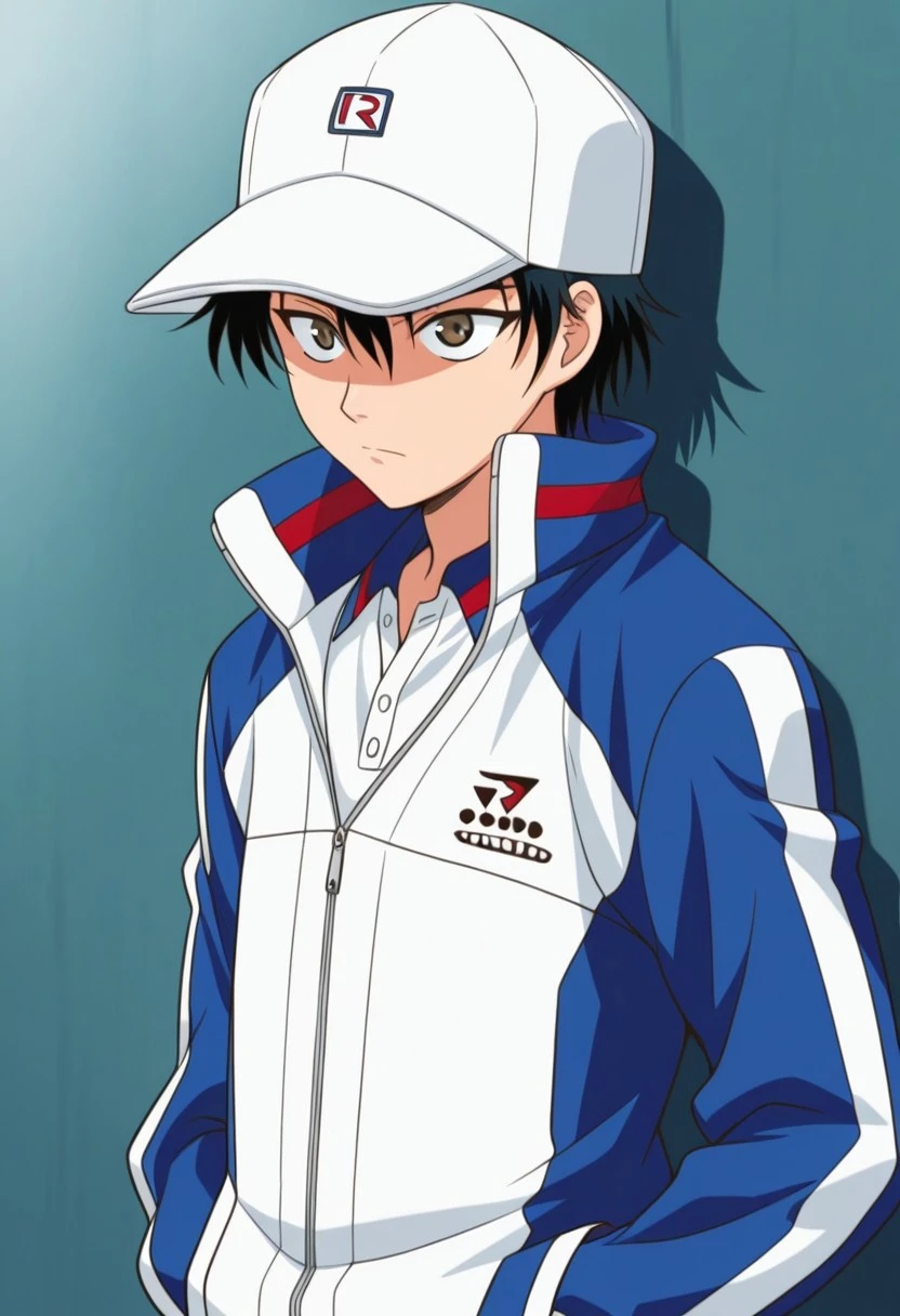 RyomaEchizen, 1boy, male focus, solo, black hair, hat, baseball cap, white headwear, brown eyes, tennis uniform, jacket, track jacket, white and blue jacket, partially unzipped, polo shirt, shorts, black shorts, socks, white socks, shoes, sneakers,