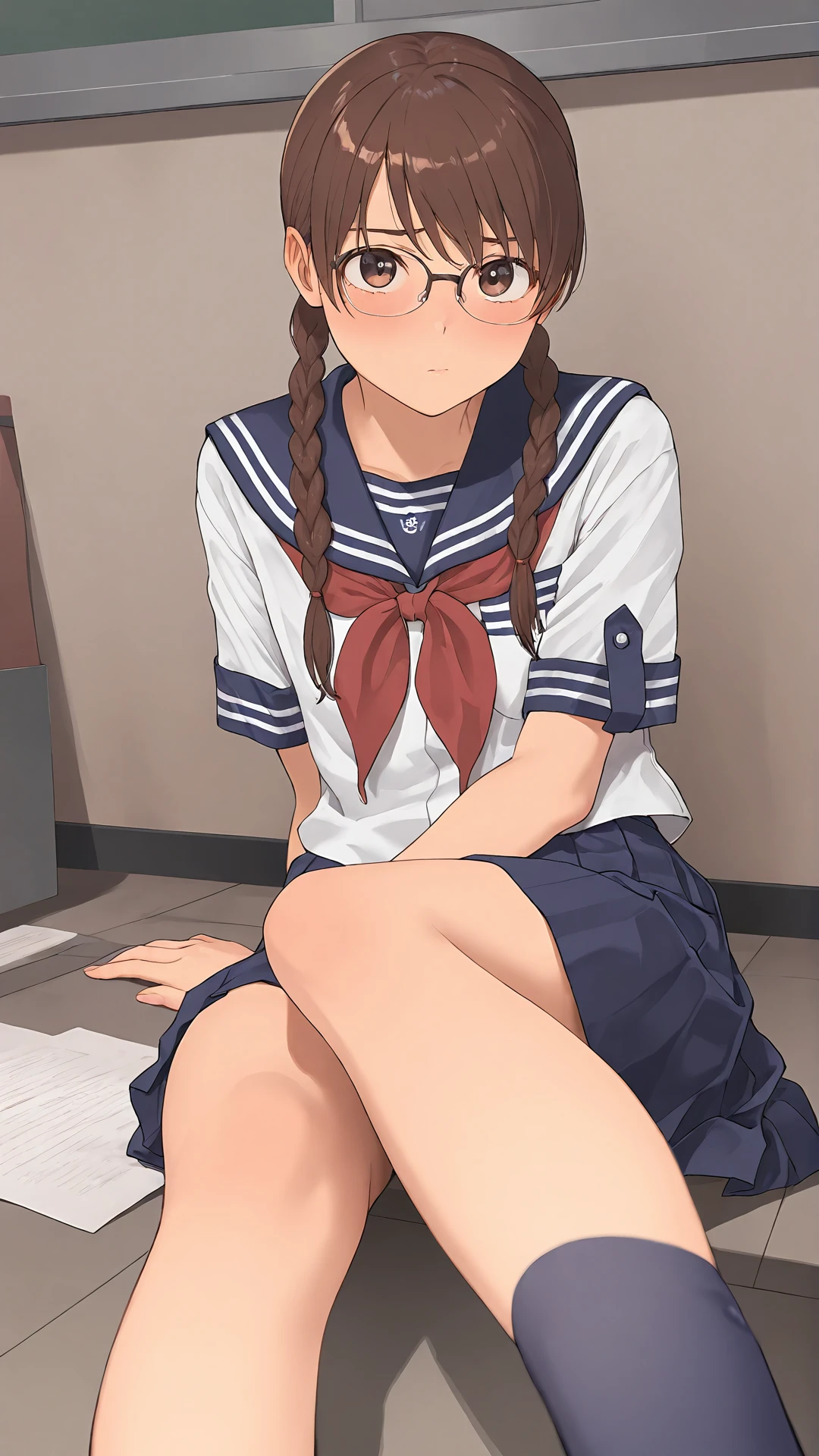 Nanase Ruo,1girl,solo,glasses,school uniform,twin braids,braid,brown hair,serafuku,brown eyes,skirt,pleated skirt,hair over shoulder,long hair,socks,