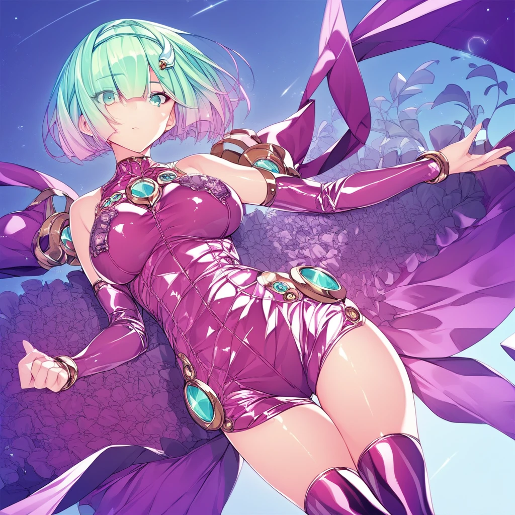 Saint Lime,green hair,short hair, hair over one eye,blue eyes, hair ornament,chest ornament, blue jewel,leotard, full covered breasts,large breasts, green back bow, green skirt, elbow gloves, white knee-boots, white highheels, white thighhighs,