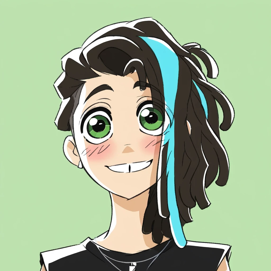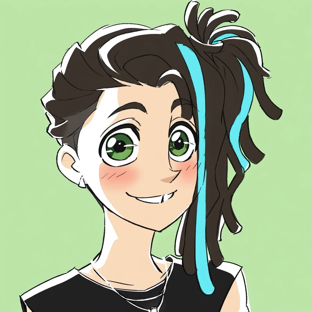 Ponta base: 1boy,solo,ponta hayari,dreadlocks,two-tone hair,green eyes,(skinny;1),earrings,dark brown hair,cyan hair highlights,tooth gap,undercut,hair bun