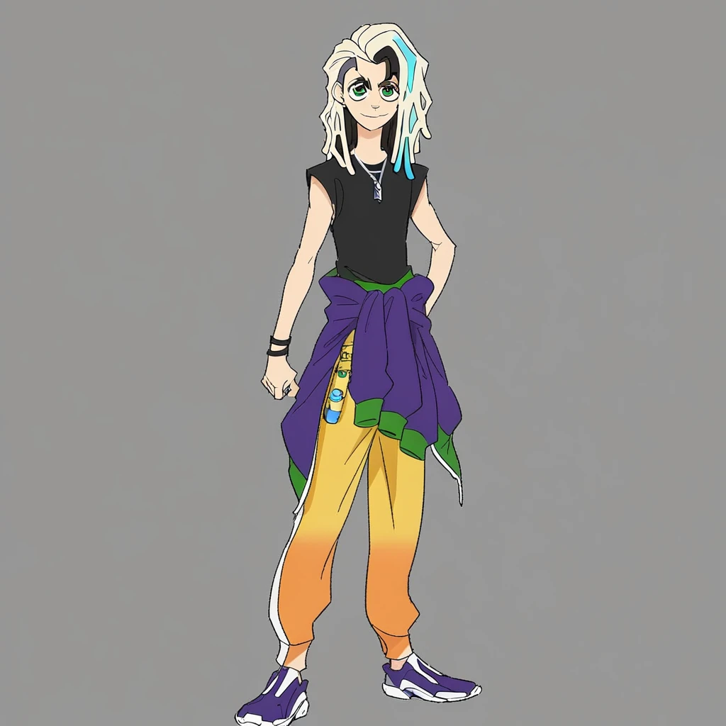 Citrus base: 1boy,solo,ponta hayari,dreadlocks,green eyes,(skinny:1),earrings,multicolored hair,dark brown hair,cyan hair highlights,light blonde hair,loose hair,long hair,undercut,tooth gap