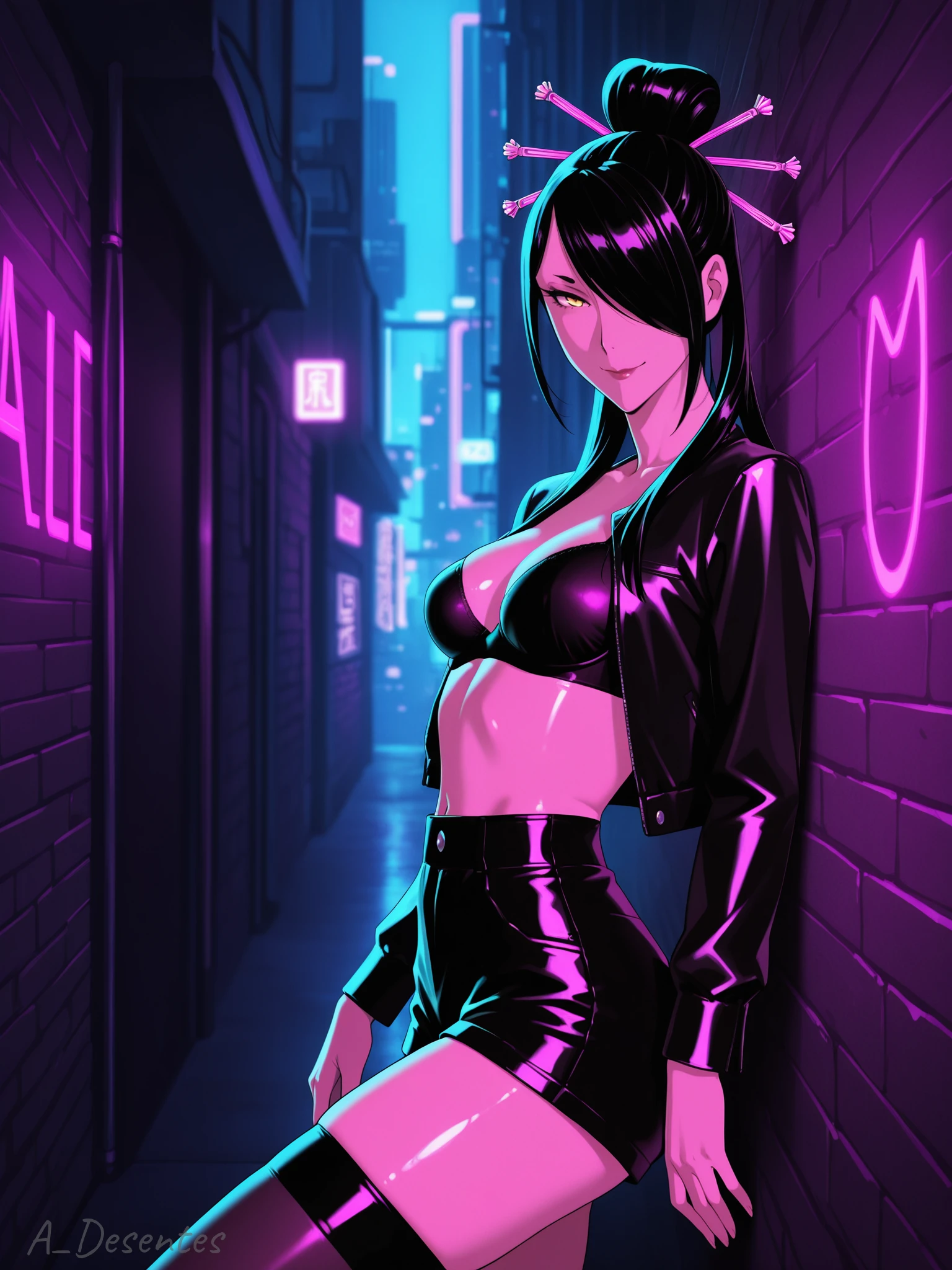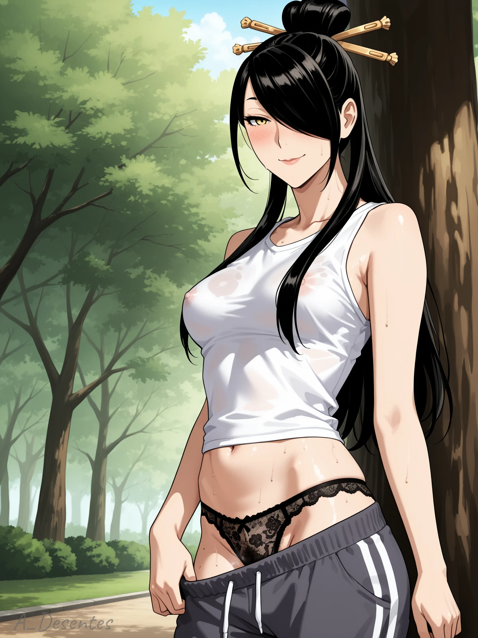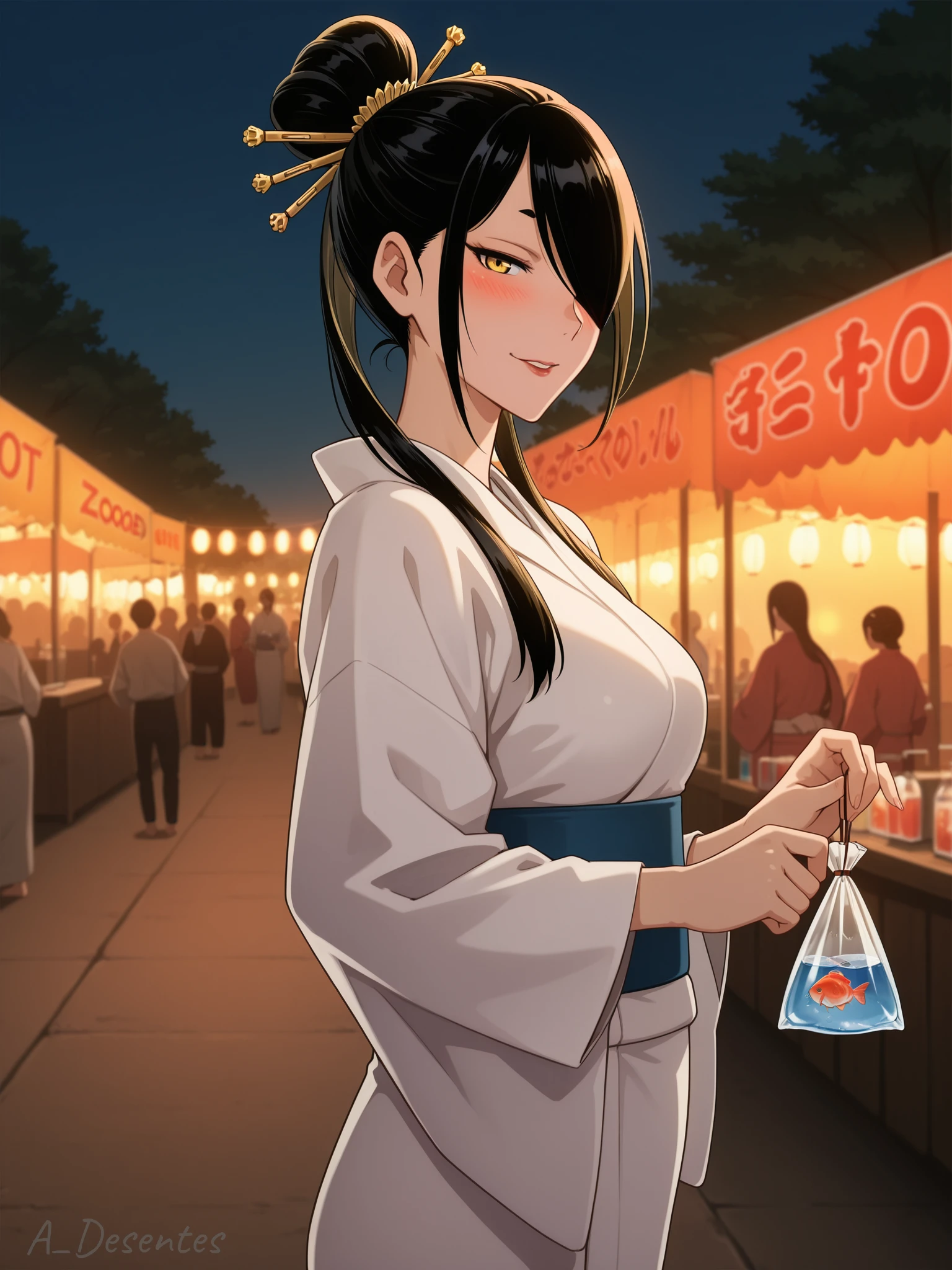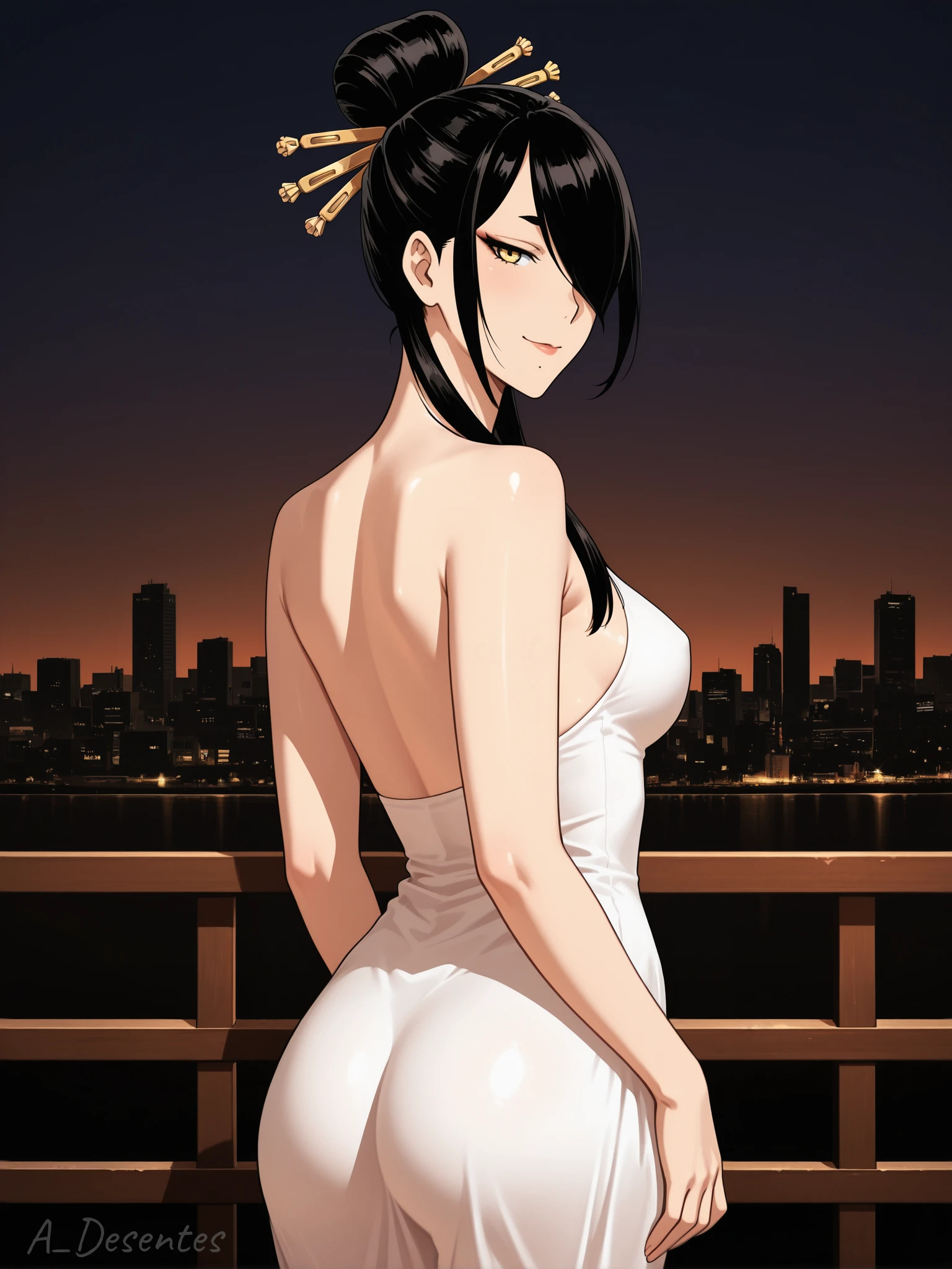 mature woman, fair skin, long face, high cheekbones, hair decoration, hair sticks, black hair, hair bun, long straight sidelocks, long bangs, (long bangs covering one eye:1.1), heavy eyelids, thin eyebrows, narrow dark yellow eye, sharp gaze, sly smile, thin lips, medium natural breasts