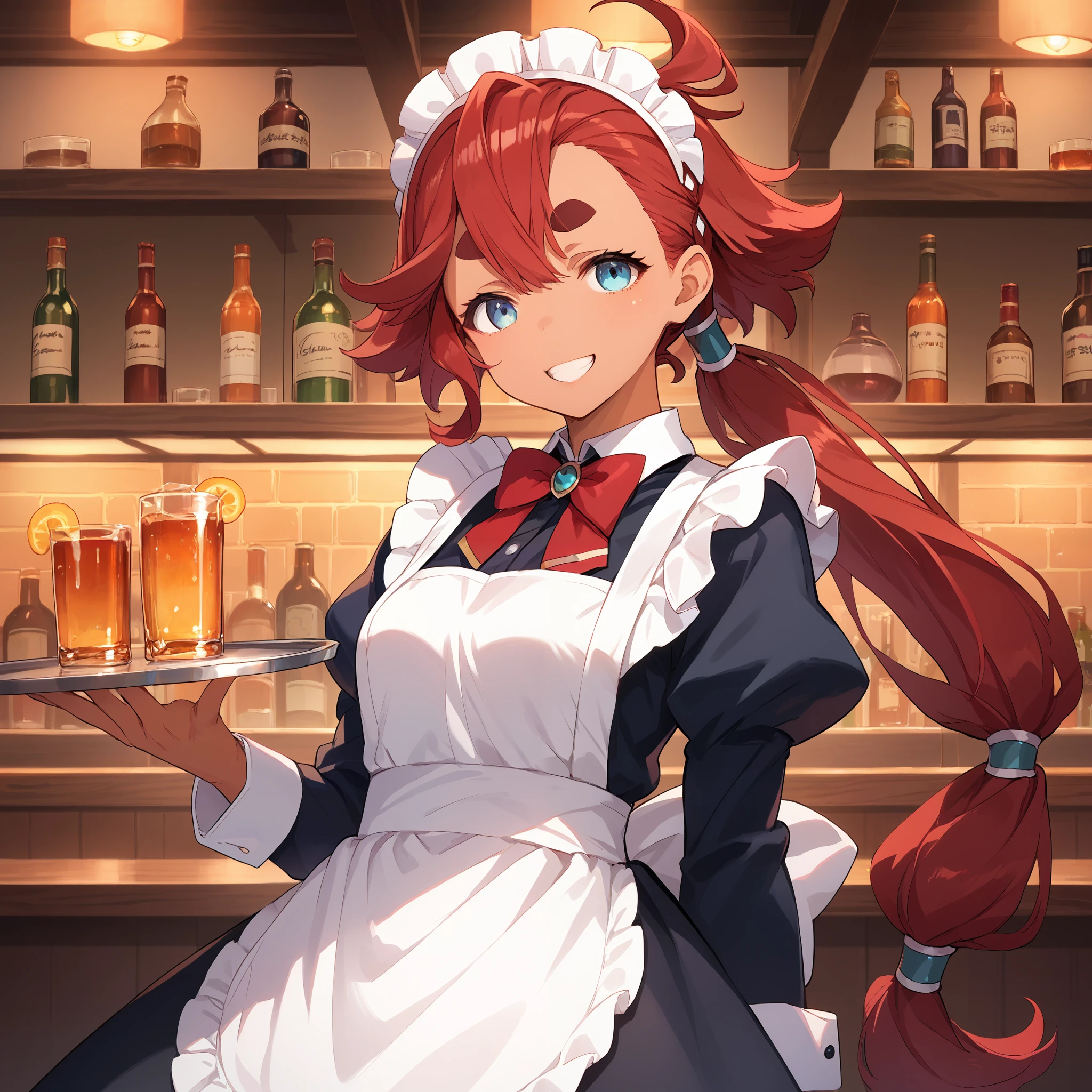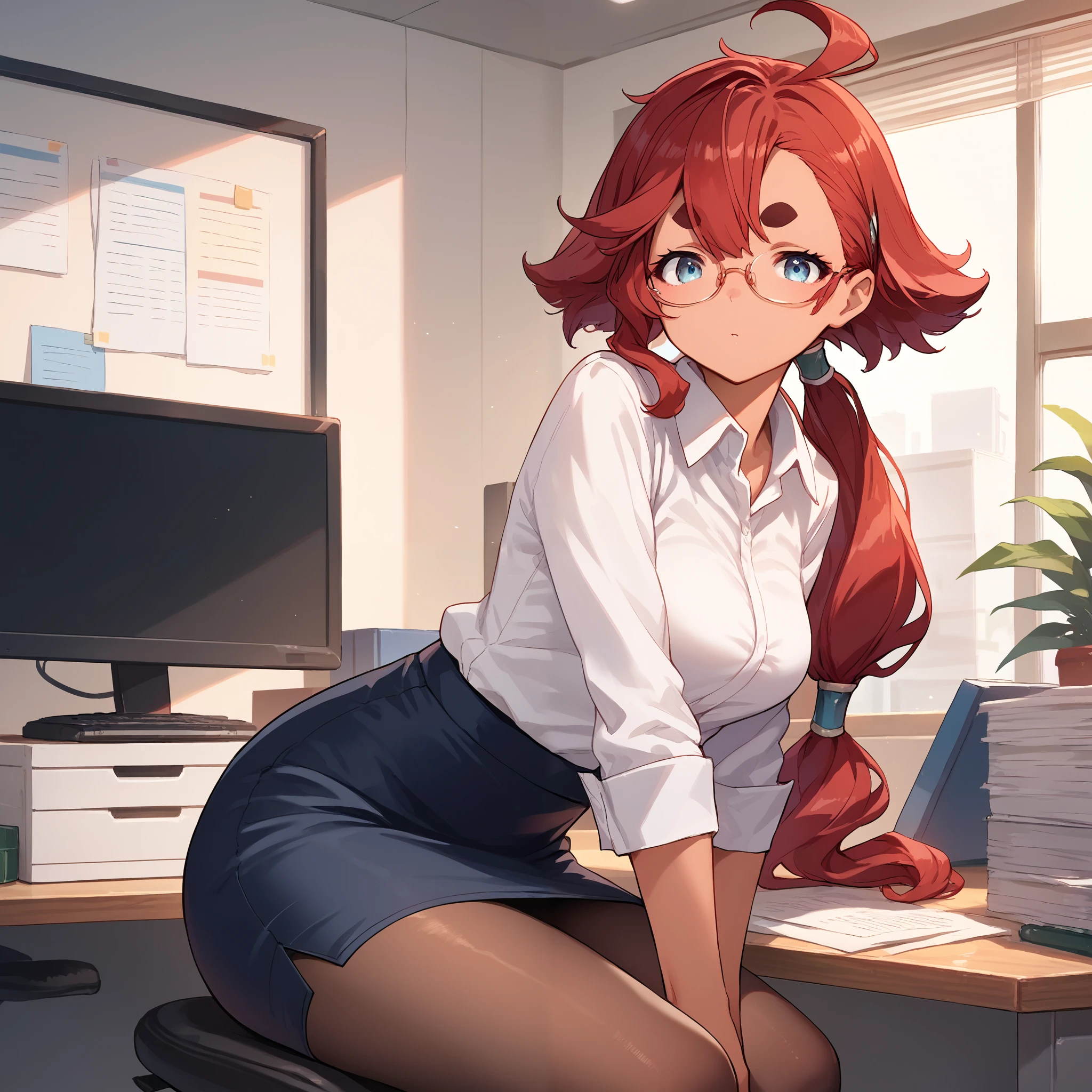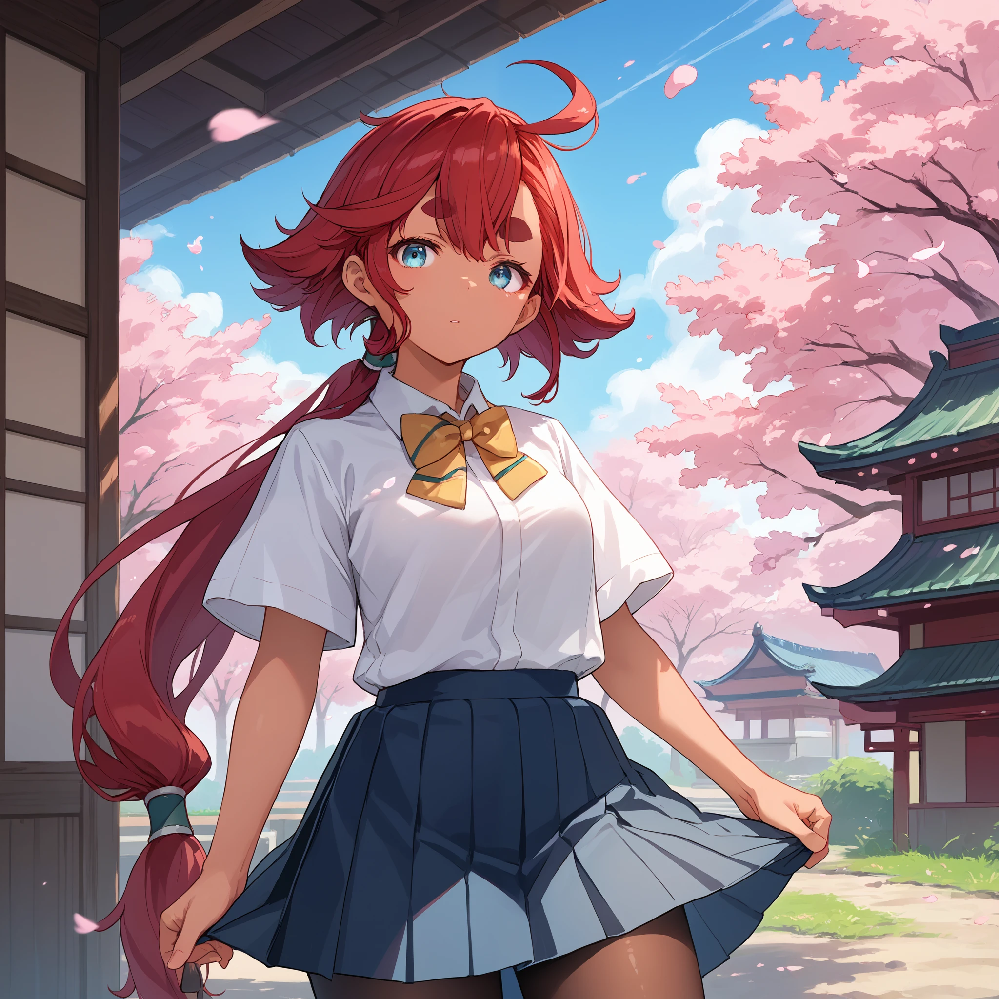 Asticassia school uniform : suletta mercury, asticassia school uniform, dark skin, red hair, long hair, low ponytail, black hairband, ahoge, blue eyes, thick eyebrows, white jacket, long sleeves, yellow necktie, shoulder boards, white shorts,Description