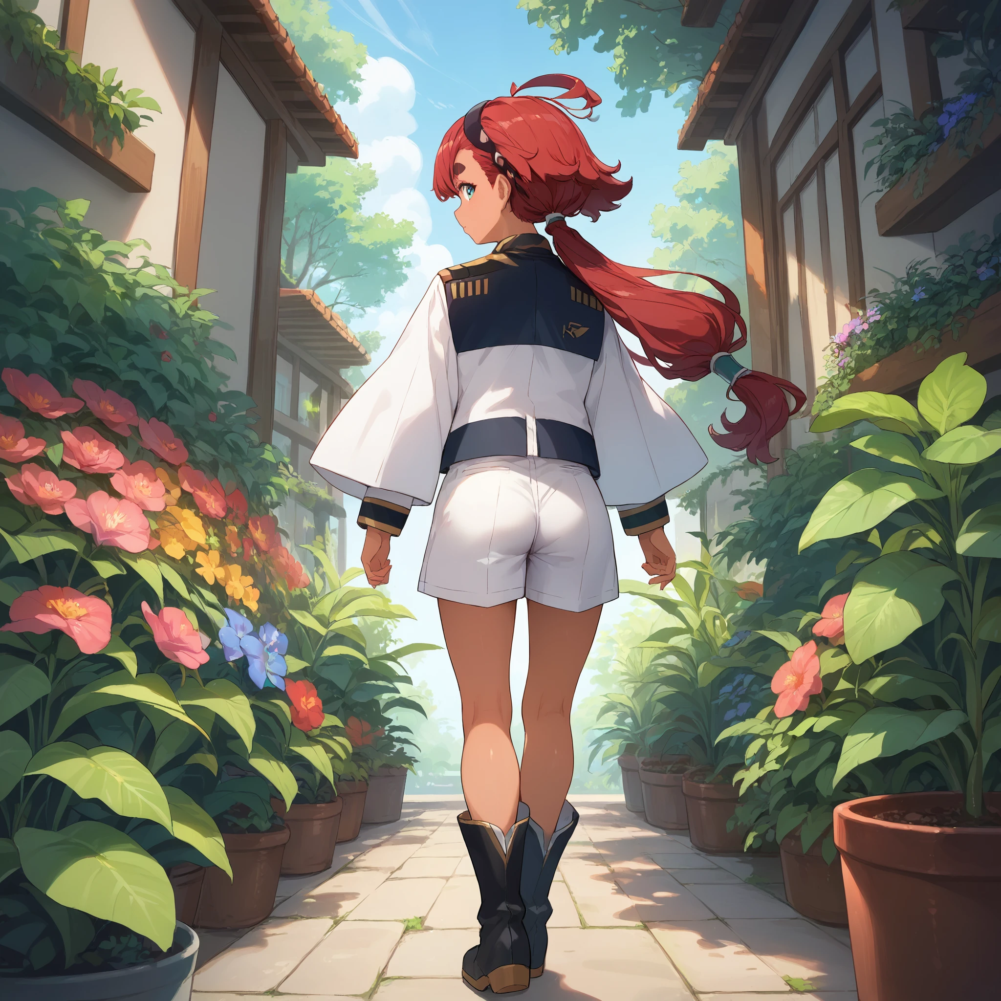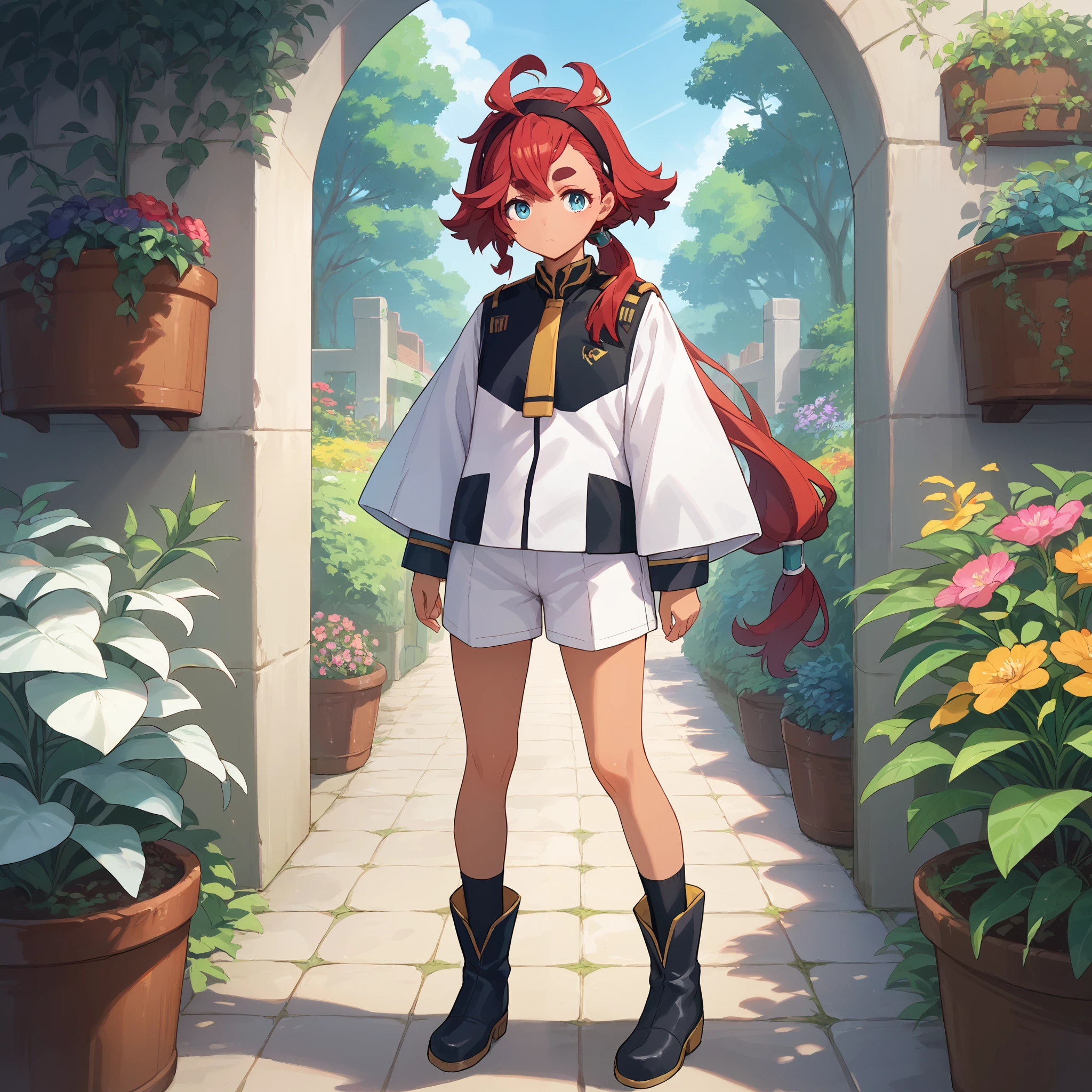 suletta mercury, asticassia school uniform, dark skin, red hair, long hair, low ponytail, black hairband, ahoge, blue eyes, thick eyebrows, white jacket, long sleeves, yellow necktie, shoulder boards, white shorts,