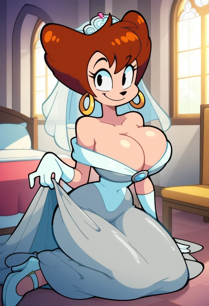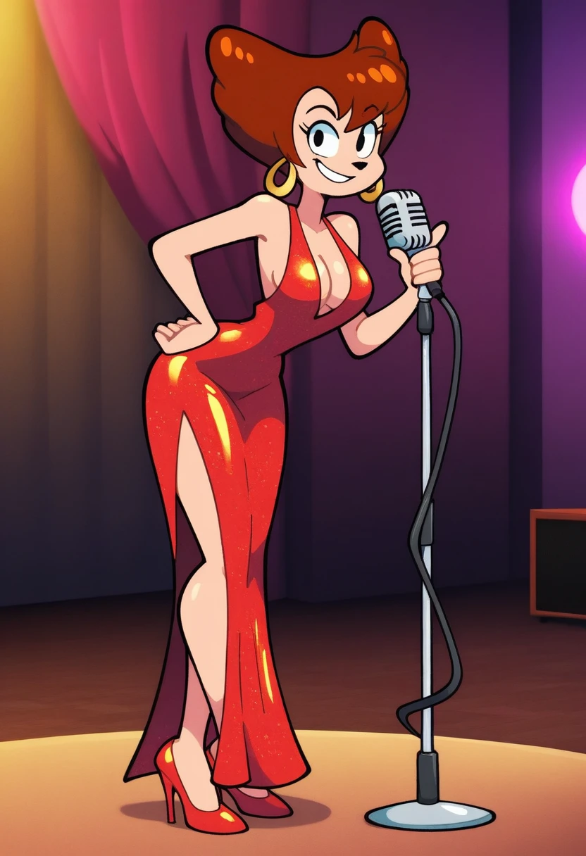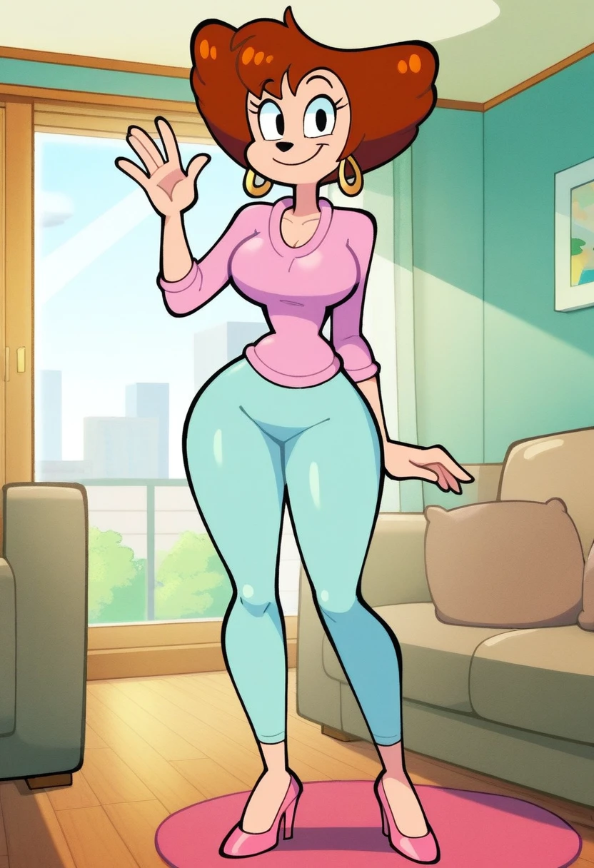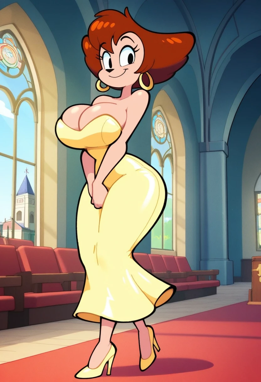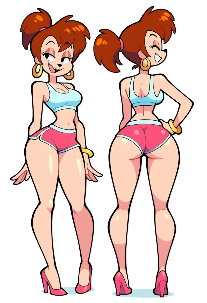 • high heels, wide hips, brown hair, eyelashes, short hair, earrings,