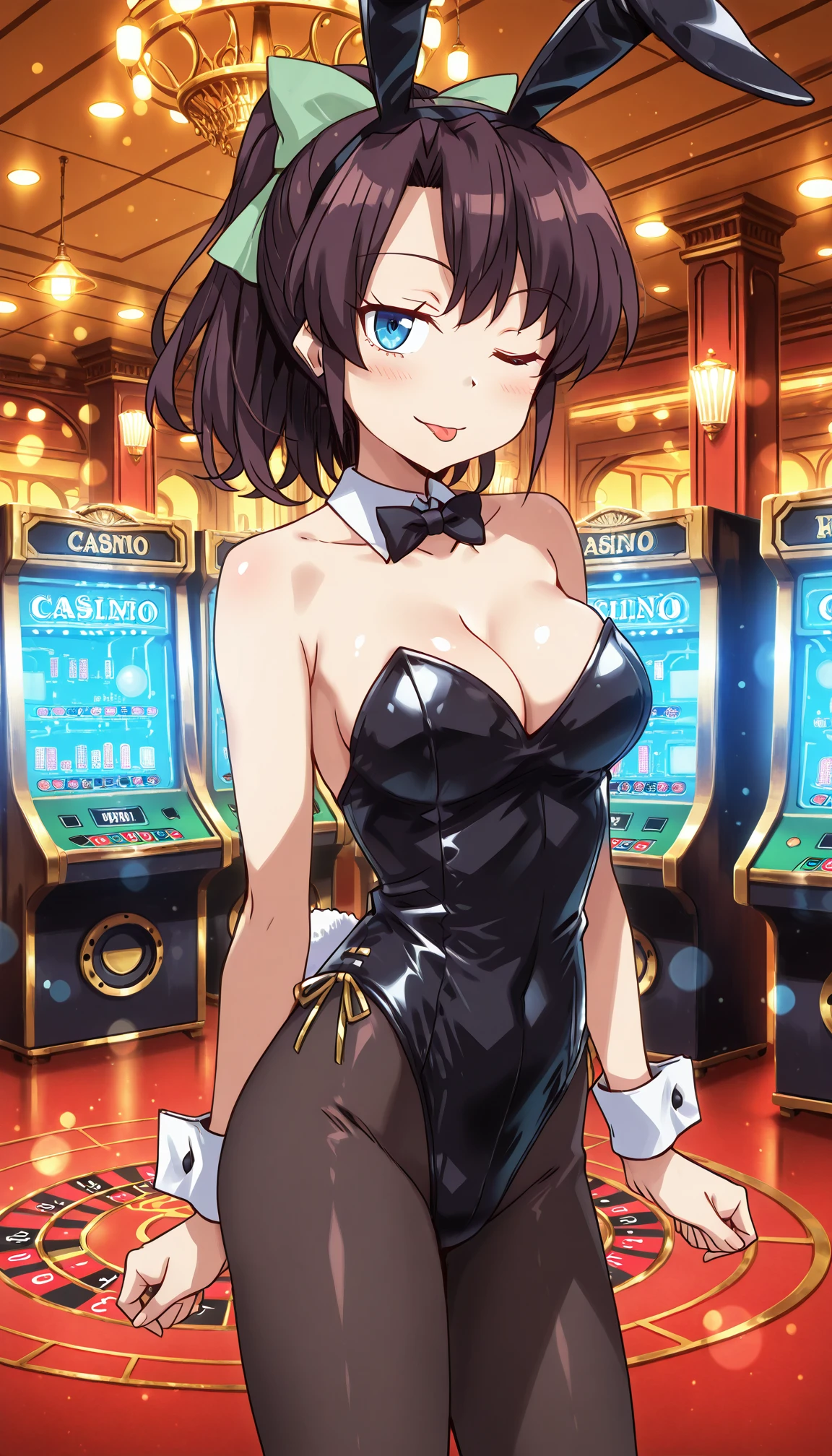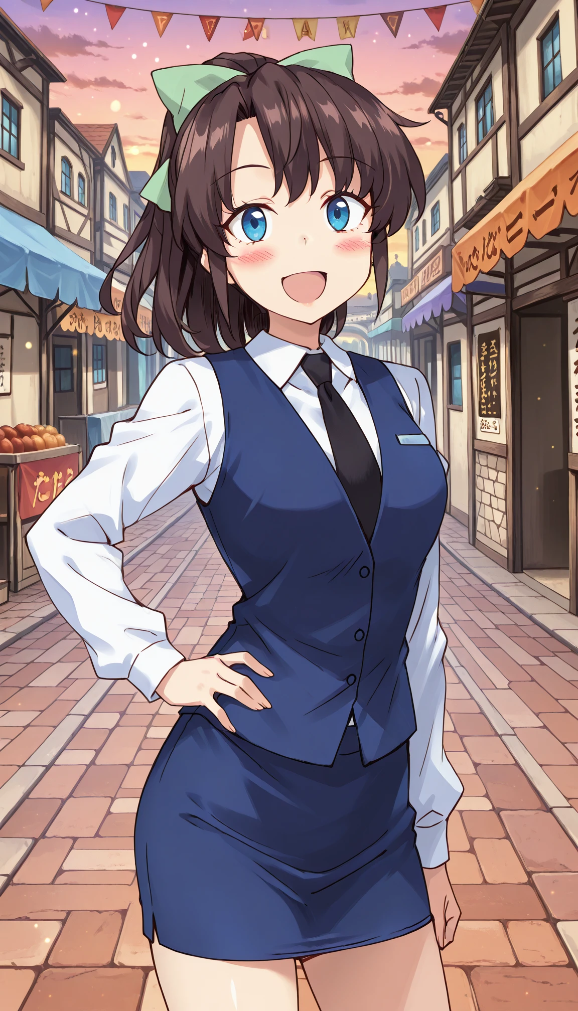 — She greets you with an open hand, crisp blue vest and tie, and a mint ribbon that bobs when she talks—polite, professional, and just a little cheeky.