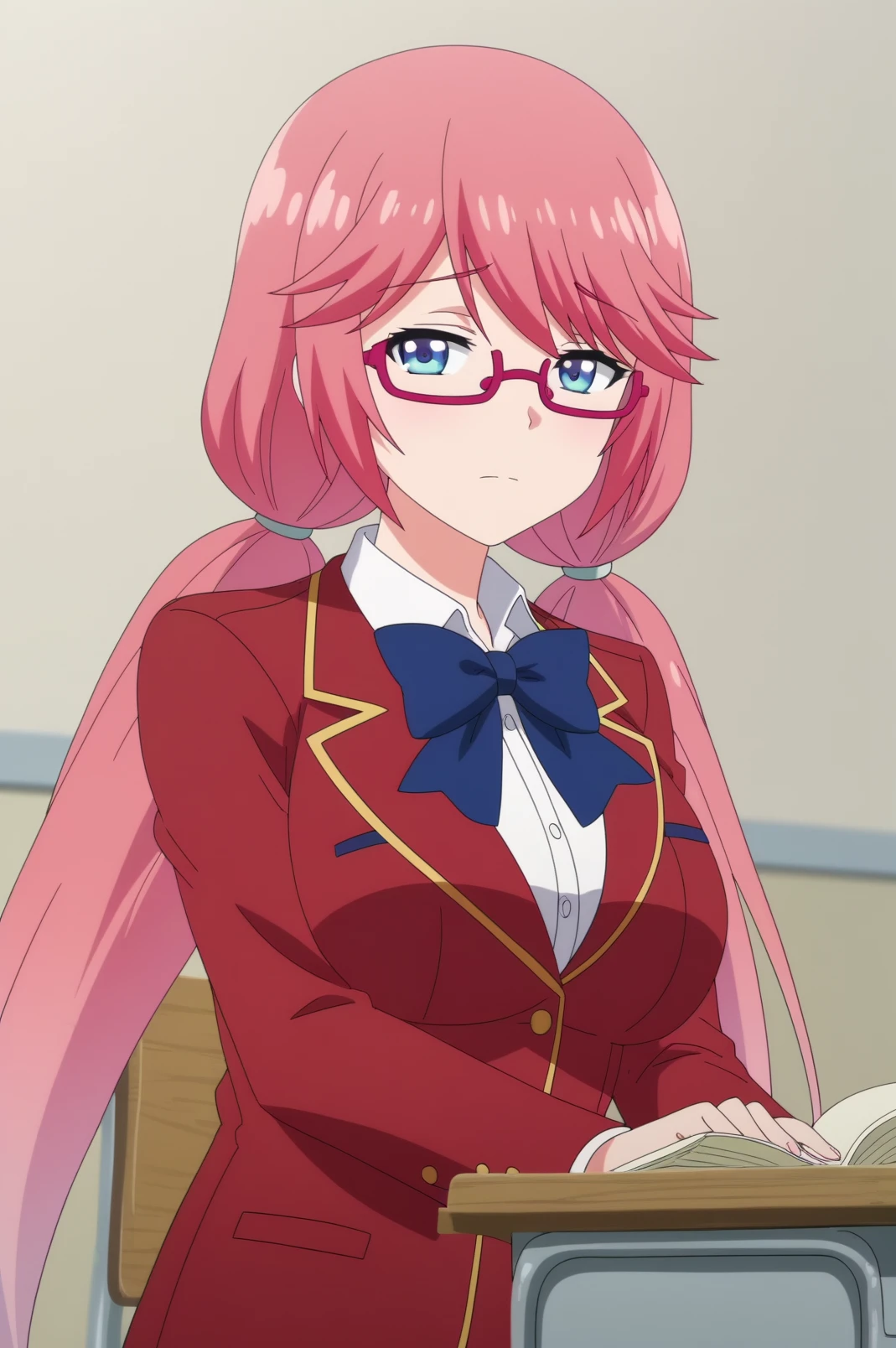 Airi Sakura,glasses,twintails,school uniform,glasses,long hair,bow,low twintails,breasts,shirt,bangs