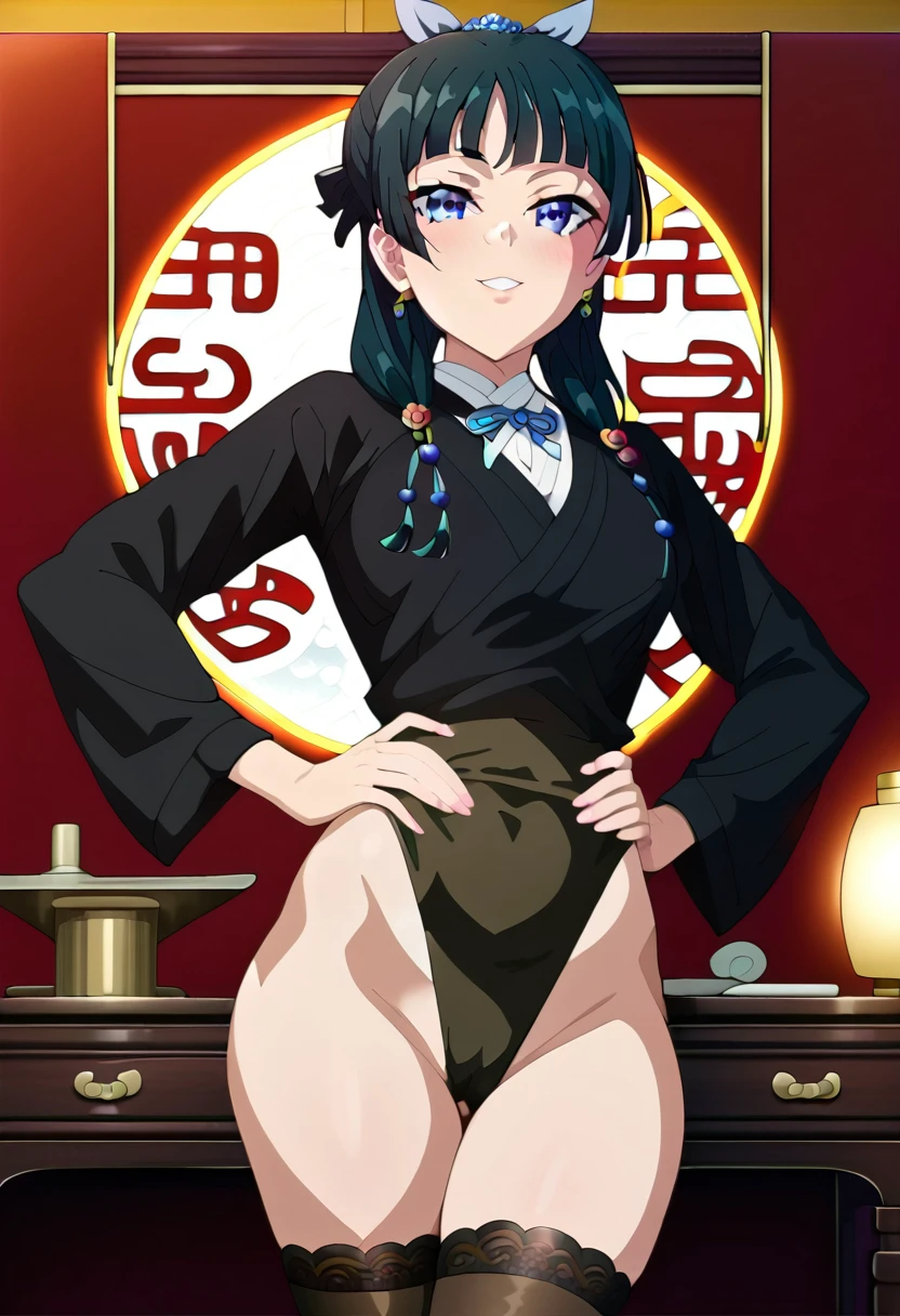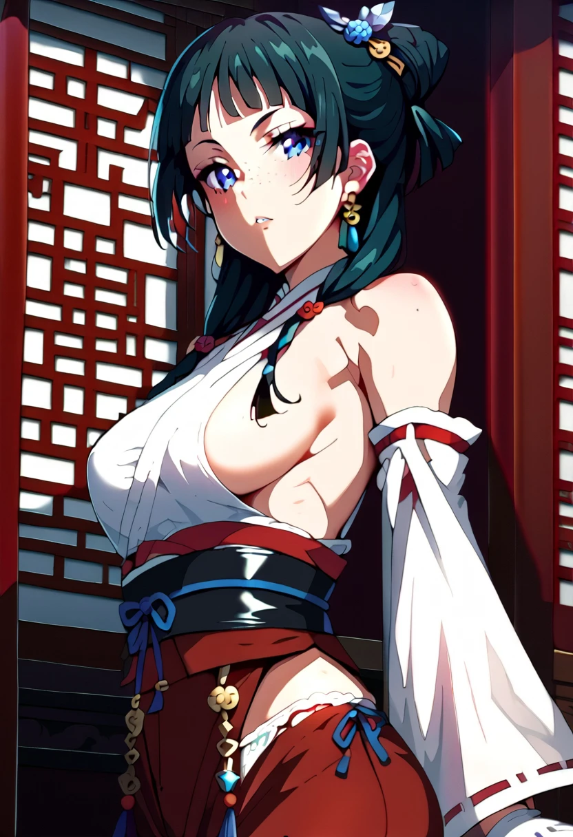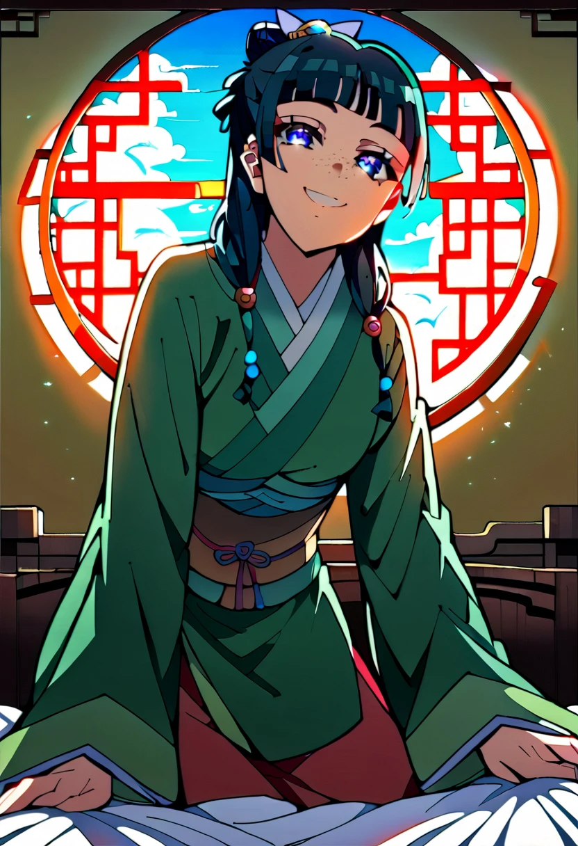 maomao, long hair, bangs, blue eyes, hair ornament, green hair, blunt bangs, freckles, hair bun, single hair bun,