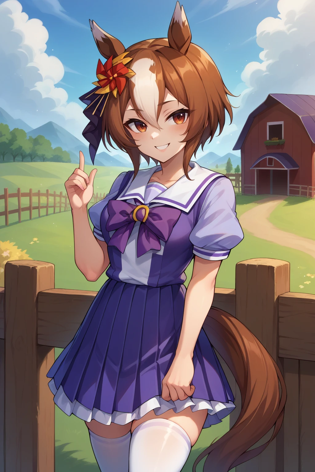 Outfit 2 : tracen school uniform, purple skirt, sailor collar, puffy short sleeves, purple bowtie, pleated skirt, white thighhighs