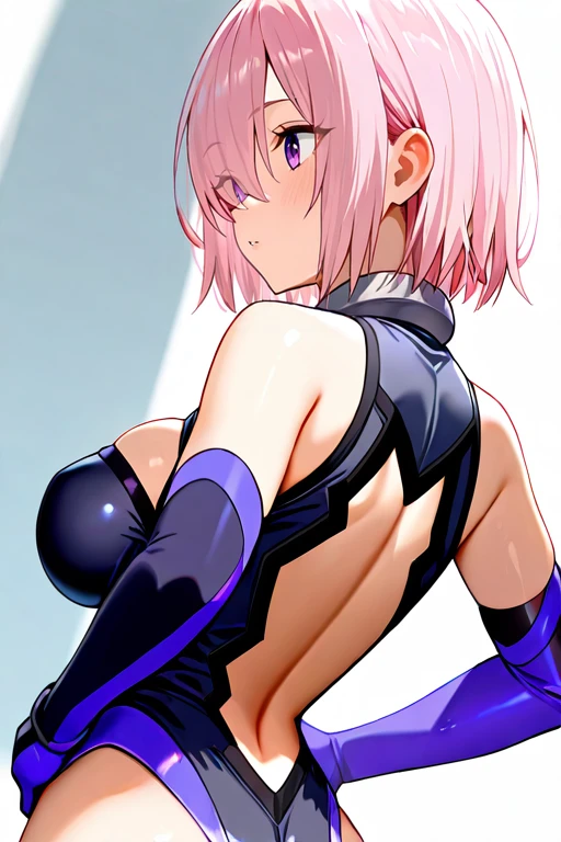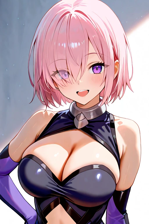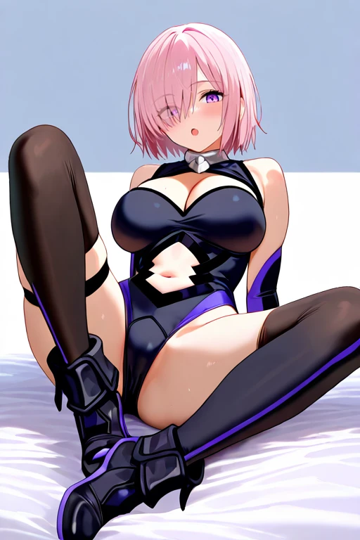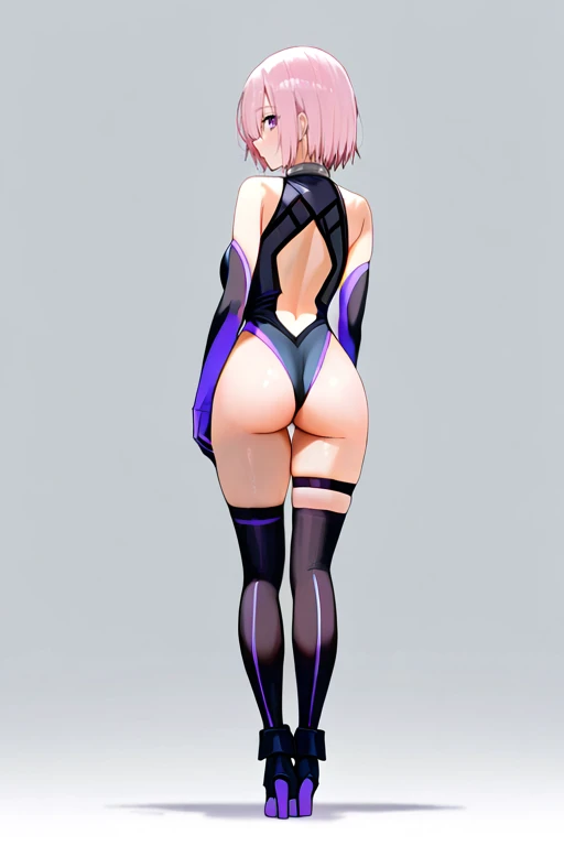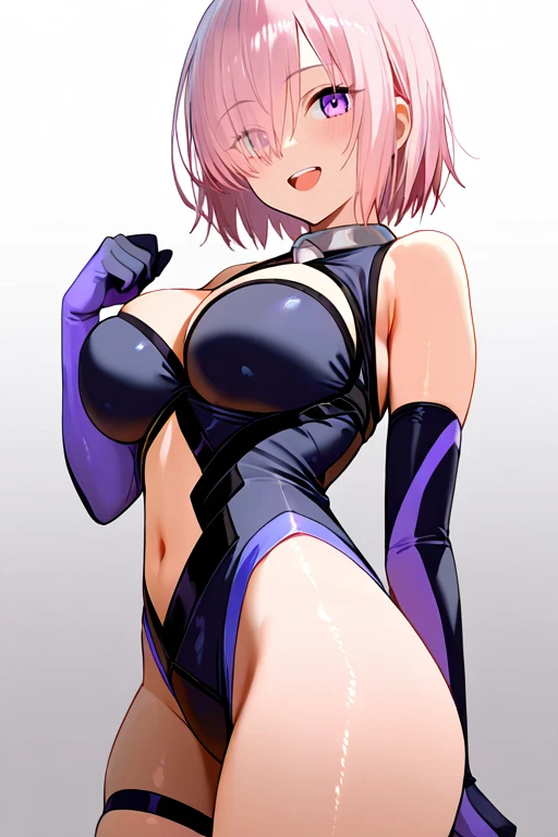 large breasts, mashdef, bare shoulders, black leotard, clothing cutout, cleavage cutout, navel cutout, back cutout, groin, elbow gloves, purple gloves, thigh strap, black thighhighs, black footwear,