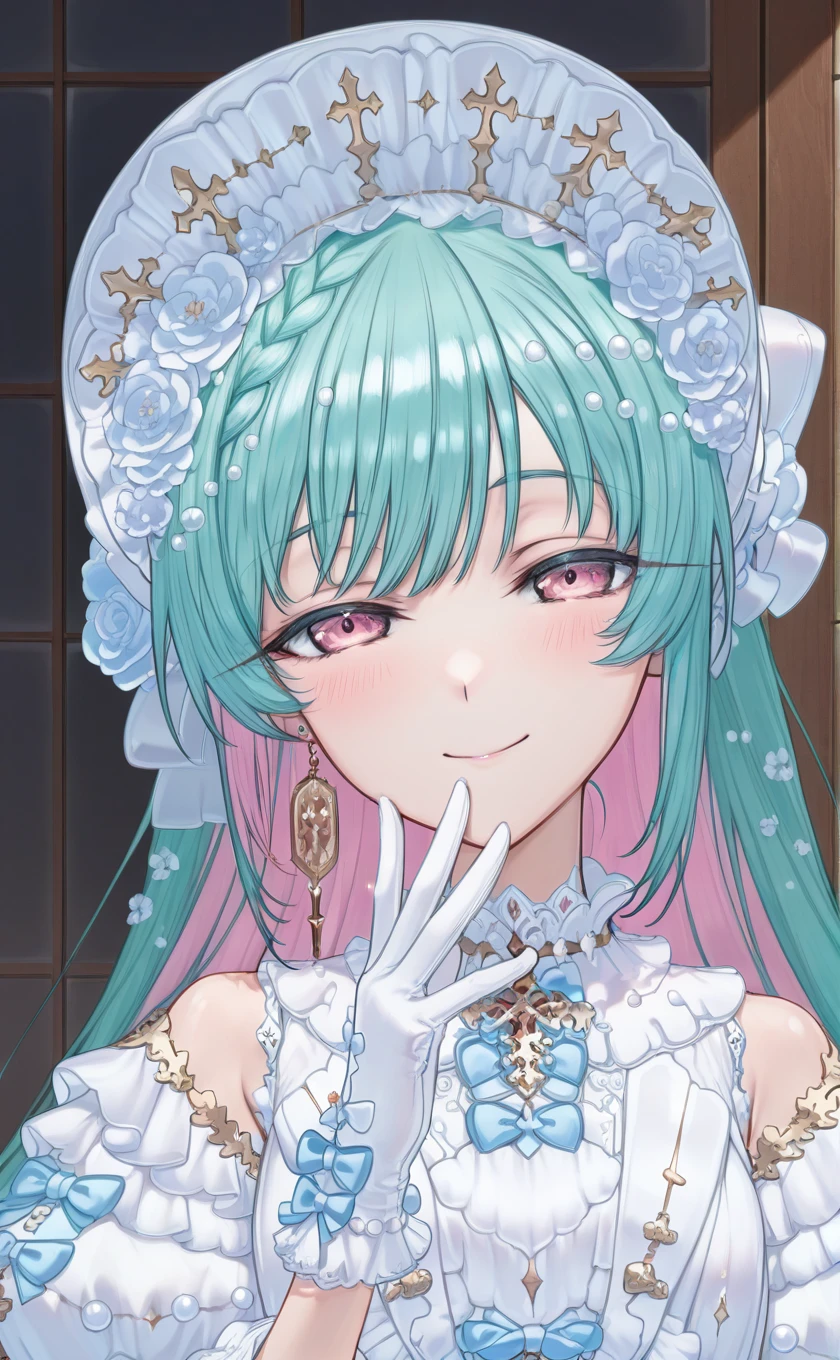 bonnet,very long hair,aqua hair,colored inner hair,pink hair,braid,hair ornament,hair flower,earrings,pink eyes