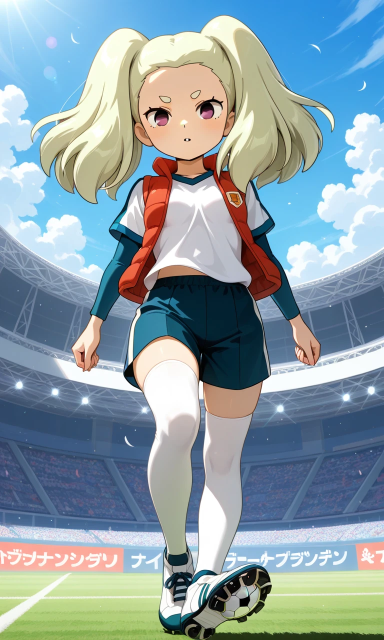 Rhoko (Inazuma Eleven), long hair, light yellow-green hair, put in long twin tails, full twintails, light red eyes, eyebrows are circular in shape, small breasts, thighs, Dark blue long-sleeved tank top under a white shirt with a dark blue collar, with a red vest on top, Black shorts with white stripes on the sides, with white leggings, dark blue soccer cleats with white soles