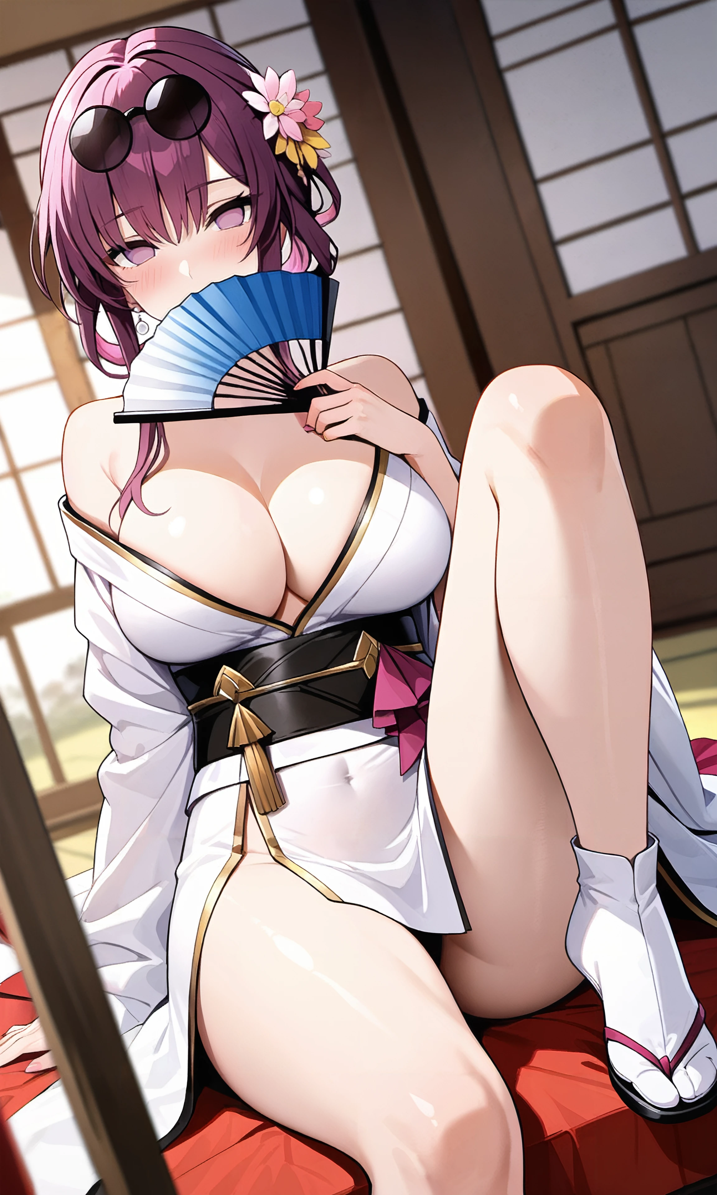 tj_kafka,purple hair,large breasts,purple eyes,no_pupils,sunglasses,eyewear on head