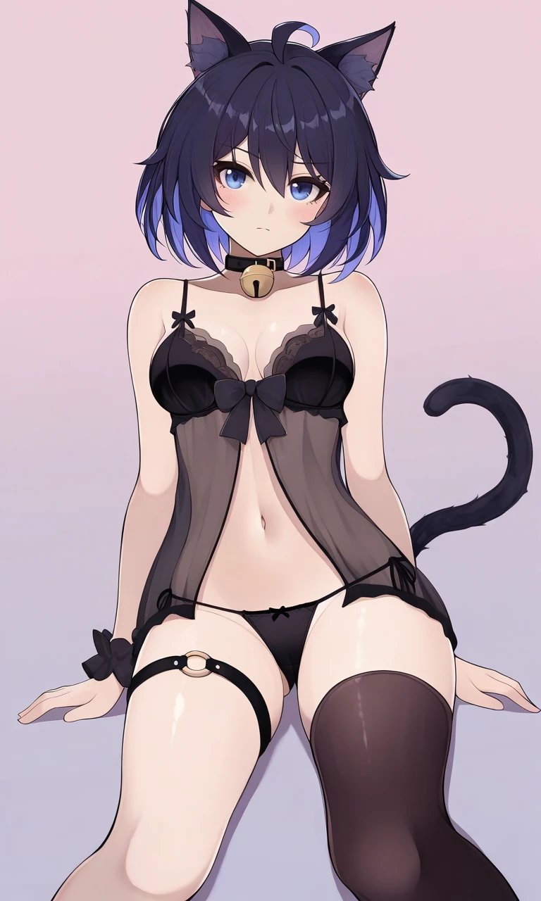 1girl, seele vollerei, cat girl, cat ears, cat tail, black choker, black collar, neck bell, animal collar, lingerie, black bra, black bow, black panties, string panties, black babydoll, bare shoulders, uneven legwear, asymmetrical legwear, o-ring thigh strap, black scrunchie, wrist scrunchie, front-tie top, black single thighhigh, black single kneehigh