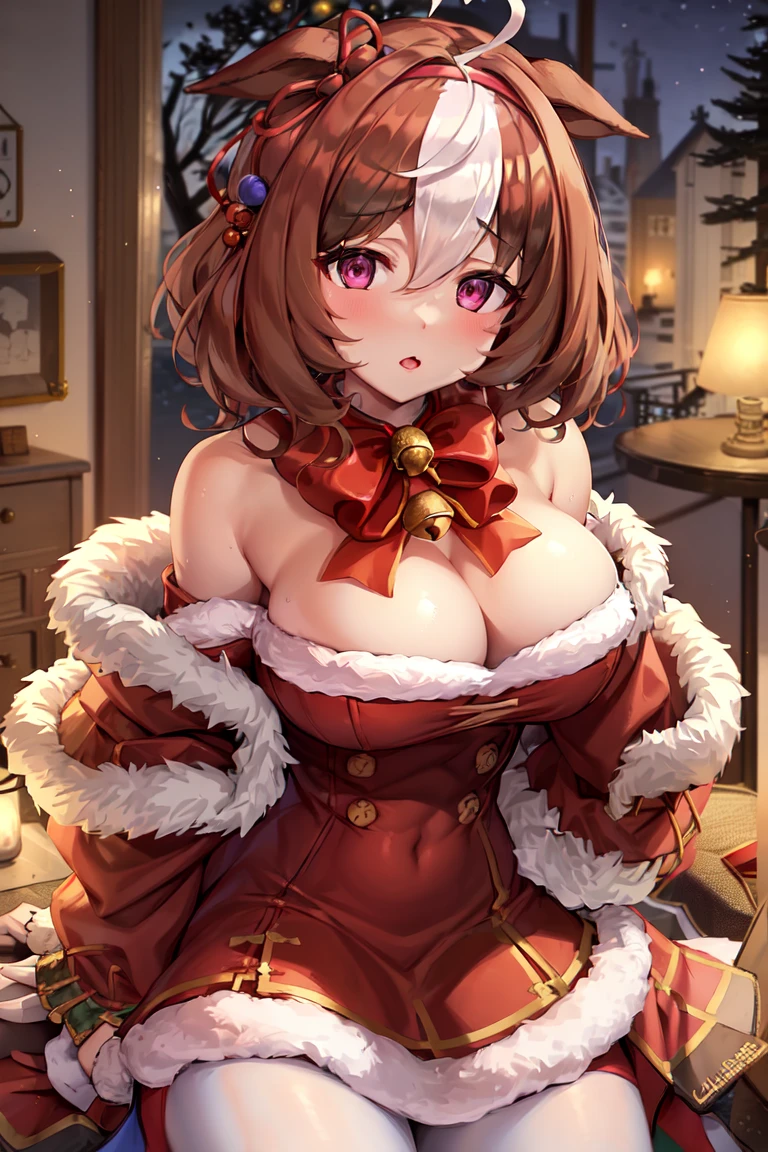 red dress, fur-trimmed dress, bare shoulders, off shoulder, christmas, fur-trimmed sleeves, off-shoulder dress, long sleeves, santa costume, cleavage, coat, bell, red bowtie