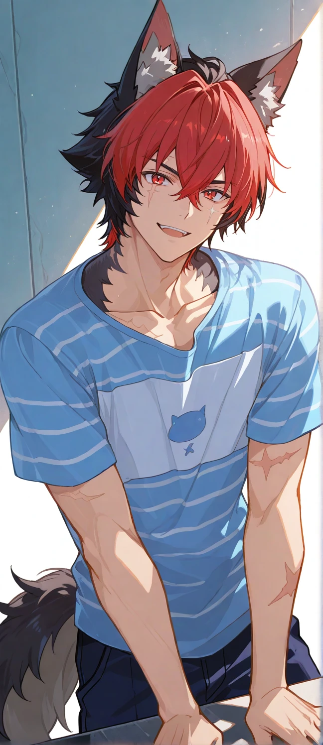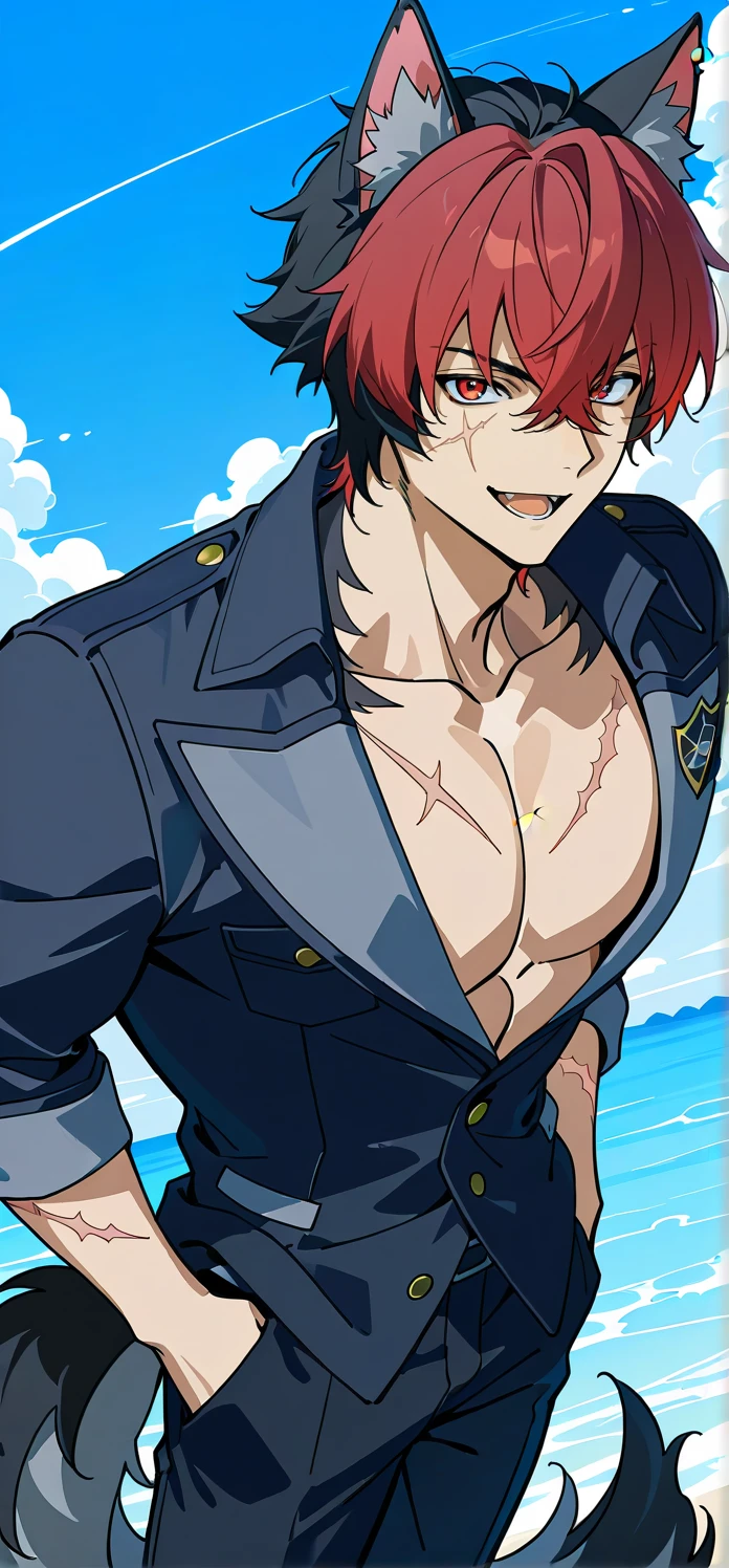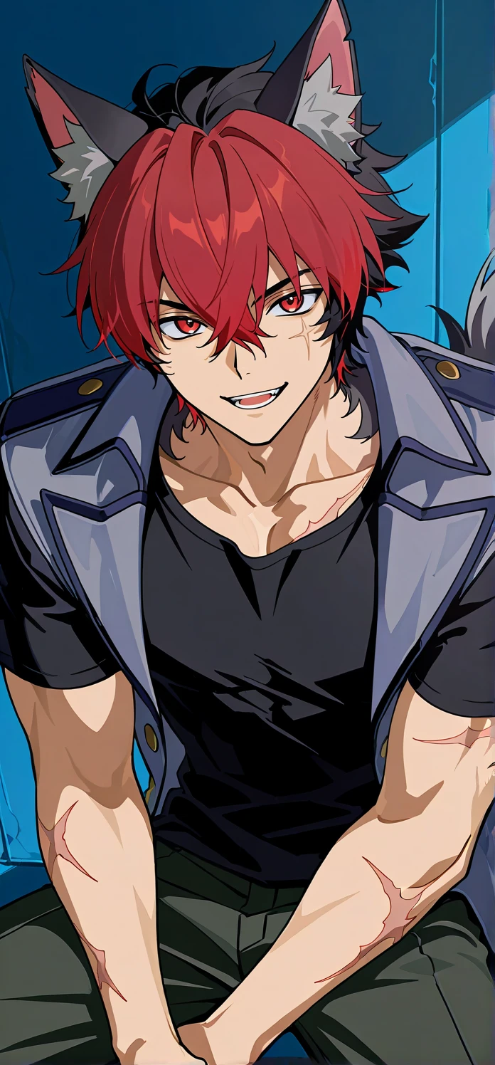 komano manato,black hair,red hair,multicolored hair,two-tone hair,short hair,animal ears,red eyes,scar,hair between eyes,wolf boy,animal ear fluff,scar on face,scar on arm,scar on chest,wolf tail,dark skin,scar across eye,multiple scars
