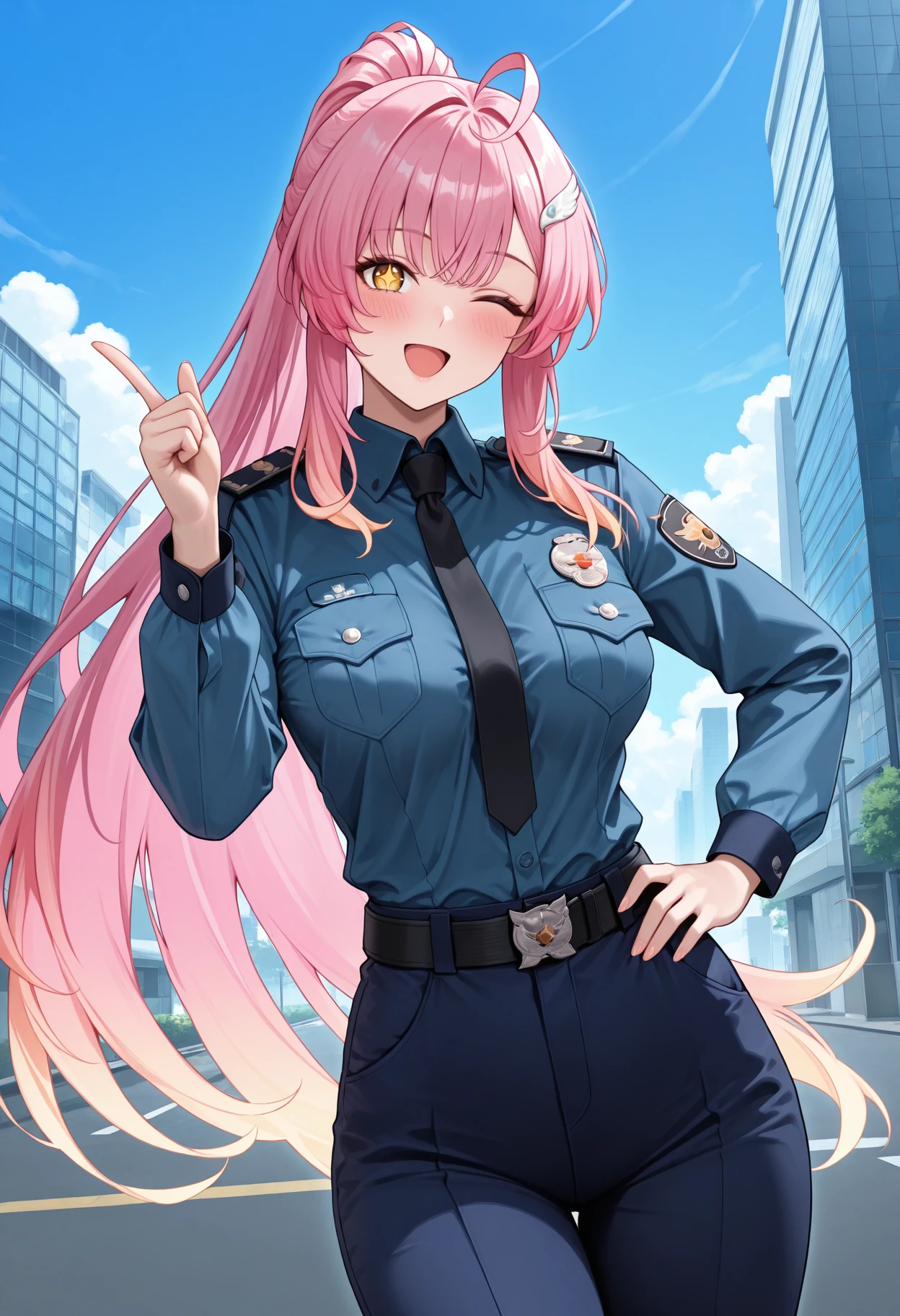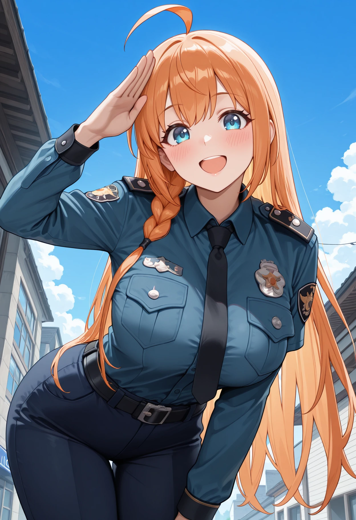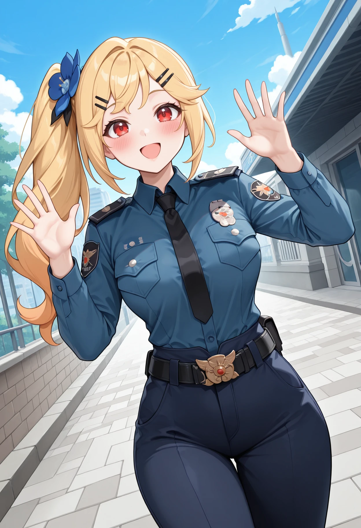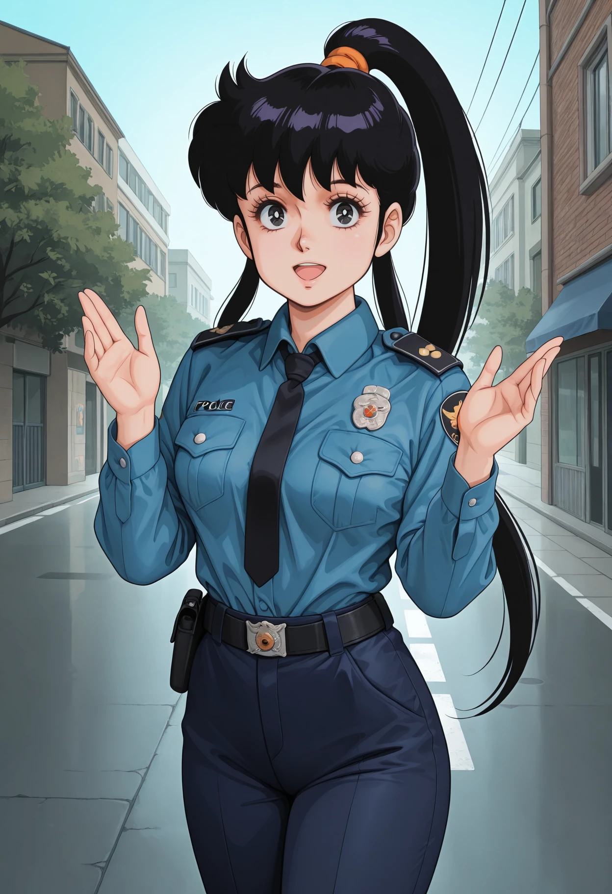 police uniform, long sleeves, collared shirt, blue shirt, black necktie, black belt, belt buckle, blue pants, shirt tucked in, logo, emblem, pocket, policewoman, patch, police badge, insignia, black pants,