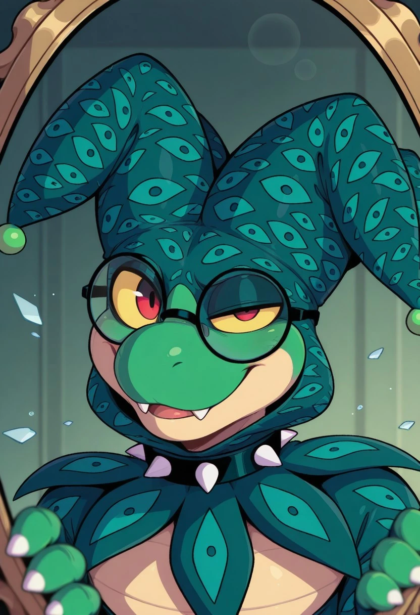 Green Jester Cap, Spiked Choker, Spiked Bracelets, Green Fingerless Gloves, Spiked Anklets, Green Toeless Socks, Green Thong, Bulge, Black Round Glasses, Eye Print
