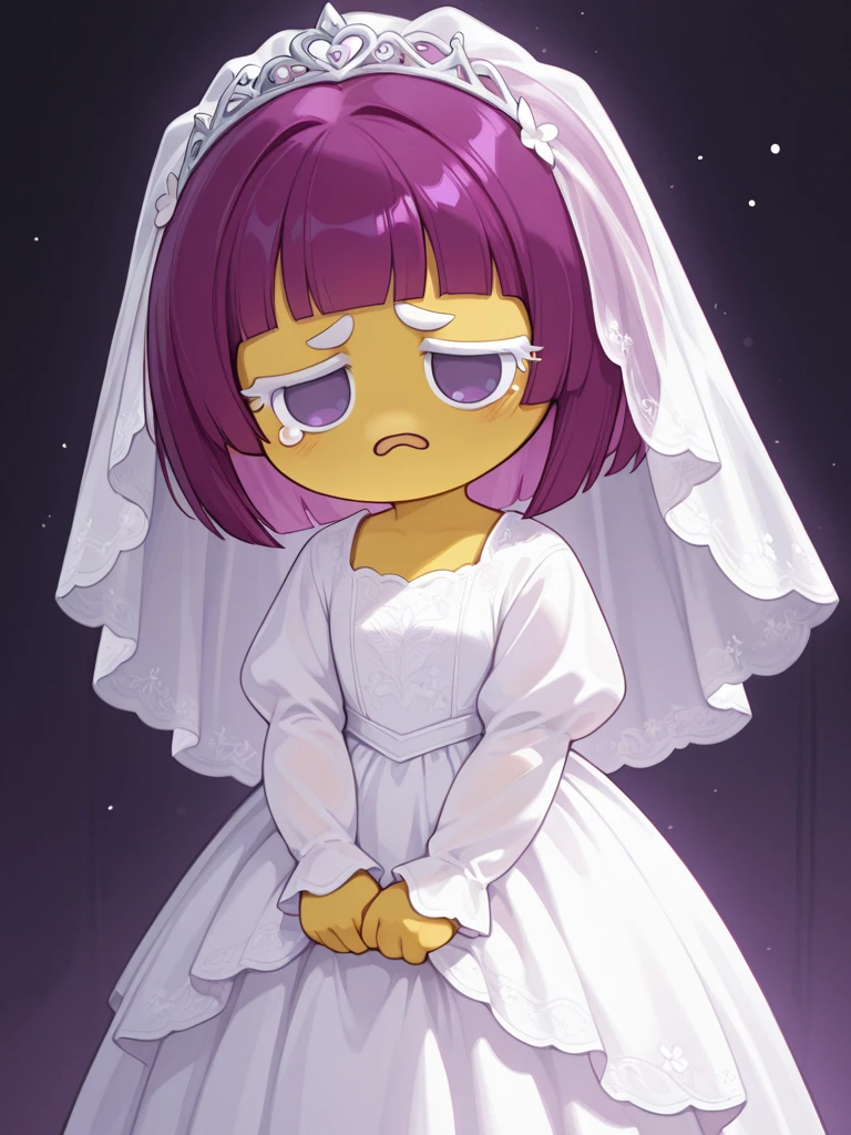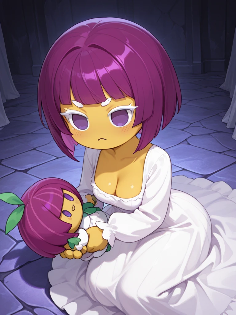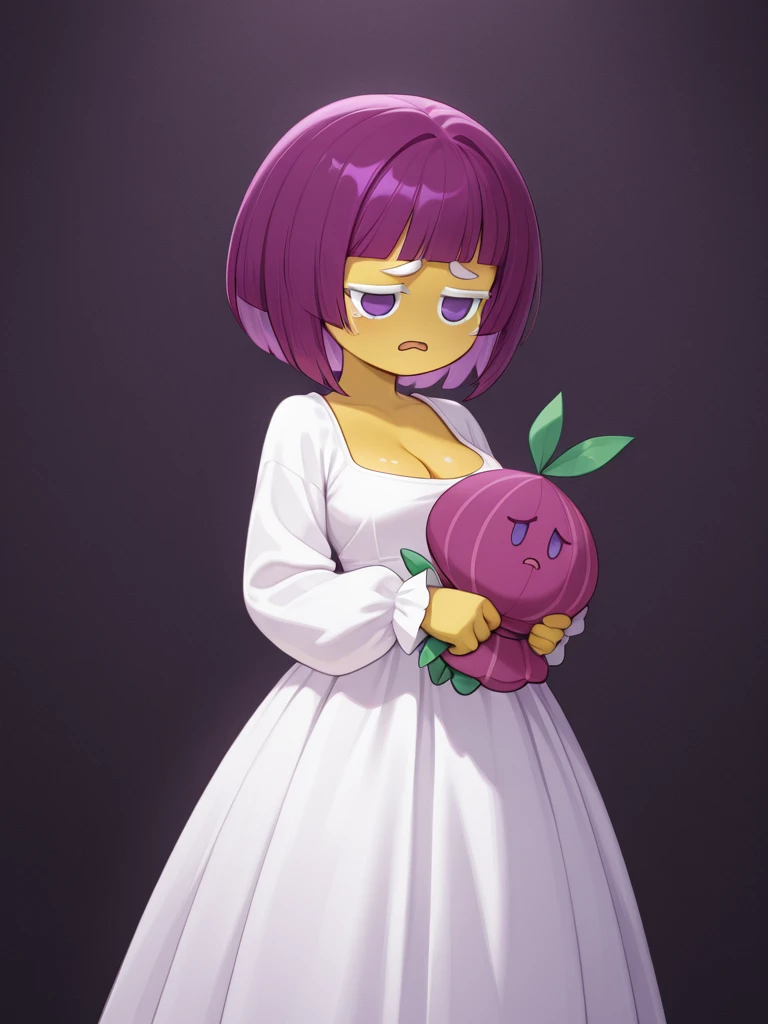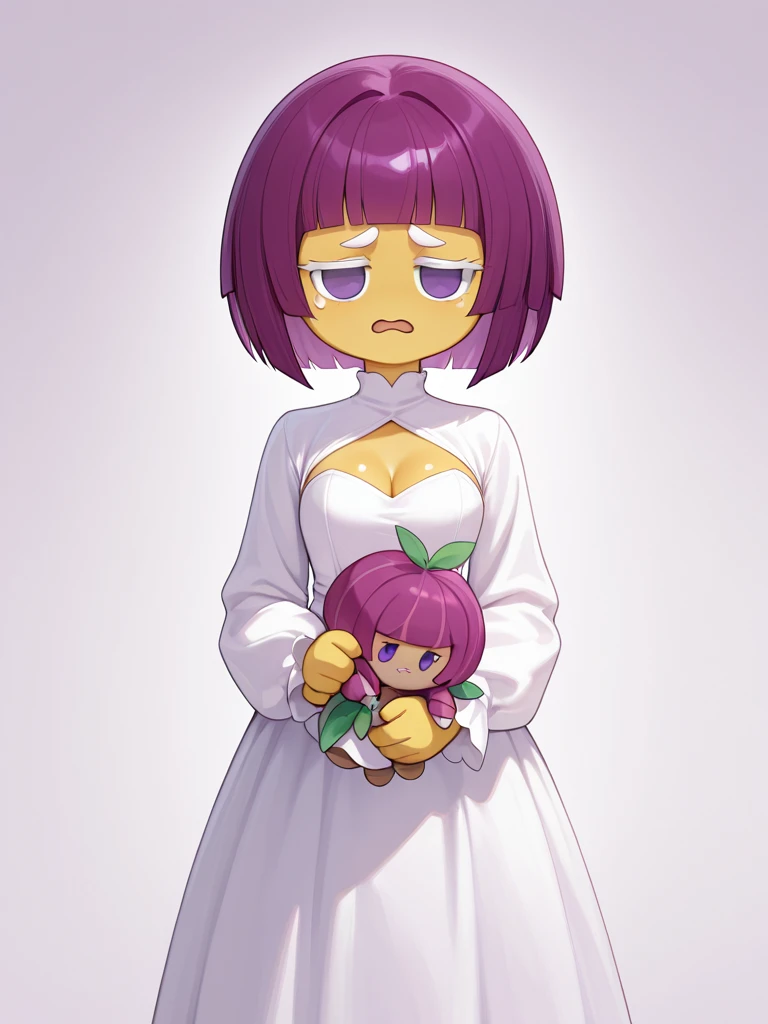 Suggested tag: crkonion, 1girl, solo, yellow skin, purple hair, light purple hair strands, short hair, white eyelashes, white eyebrows, solid purple eyes, no pupils, no sclera, no nose, white dress, long dress, long sleeves, holding doll