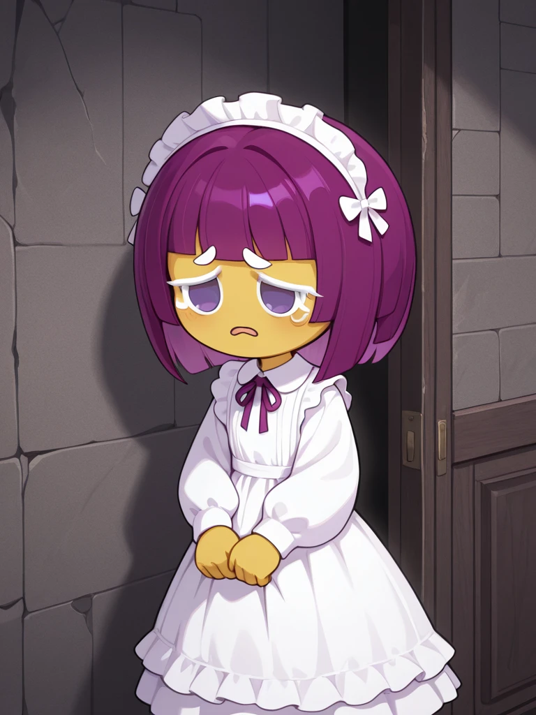 crkonion, 1girl, solo, yellow skin, purple hair, light purple hair strands, short hair, white eyelashes, white eyebrows, solid purple eyes, no pupils, no sclera, no nose, white dress, long dress, long sleeves, holding doll