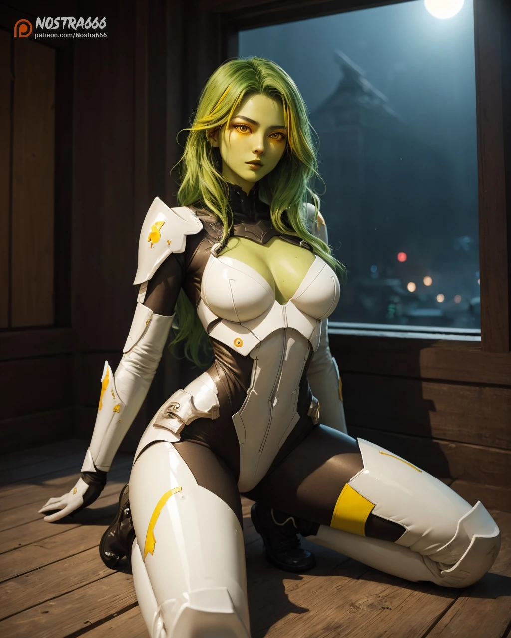 (gamoraarmorcomics, bodysuit, white and black battlesuit, white boots, white boots, green hair, yellow eyes, yellow markings on cheekbones and above eyes:1.2)