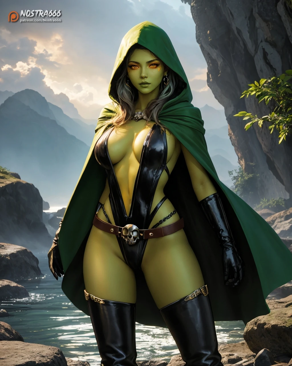(gamoraannihilationoutfit, hooded cloak, hood {on | off}, black cape, silver chain, silver circlet, silver skull earrings, black slingshot leotard, cleavage, center opening, black elbow gloves, silver skull buckle, silver belt, (black thigh-high boots:1.1), green hair, (white empty eyes:1.1), (yellow markings on cheekbones and above eyes:1.1):1.1)