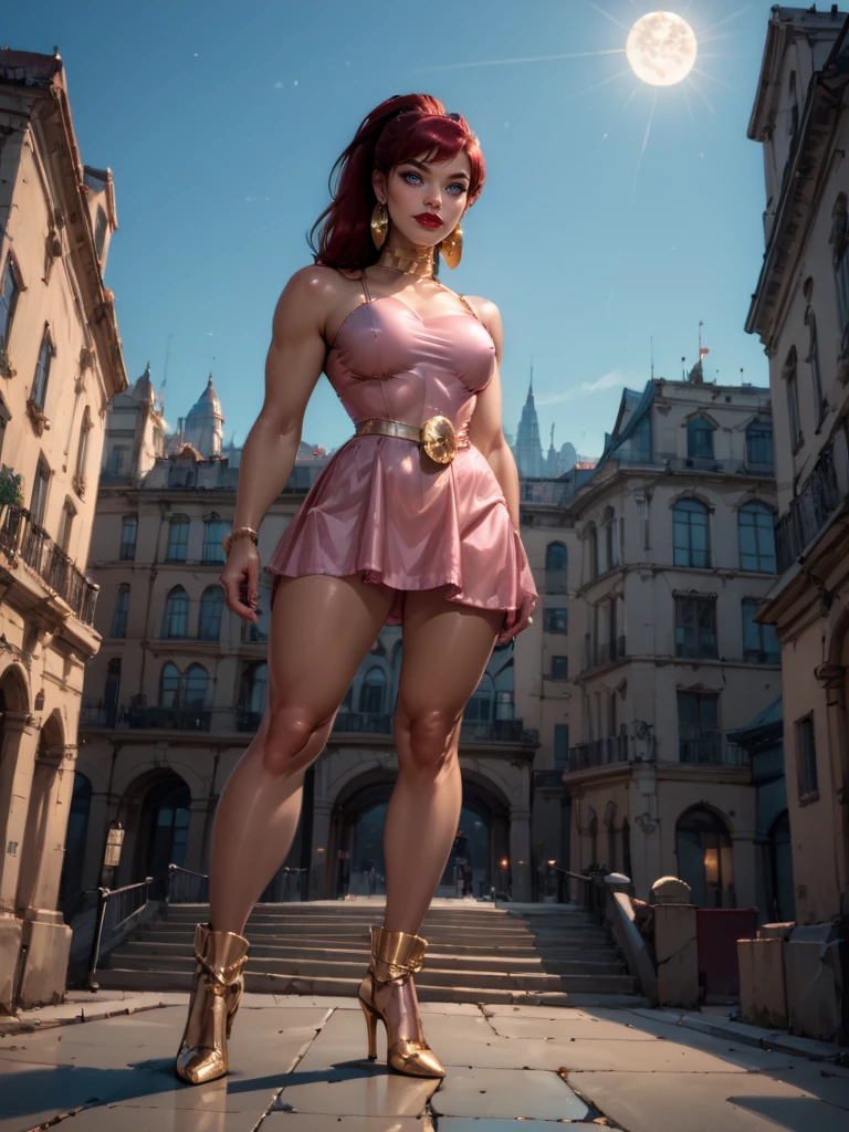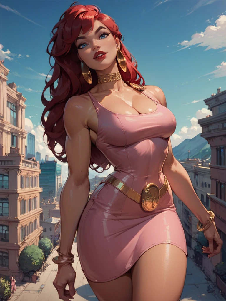 Prompt: Giganta, 1girl, jewelry, hoop earrings, pink dress, red hair, bracelet, lipstick, long hair, breasts, blue eyes, cleavage