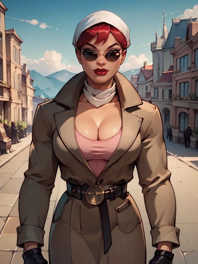 sunglasses, black gloves, trench coat, belt, red hair, lipstick, breasts, cleavage, scarf, short hair