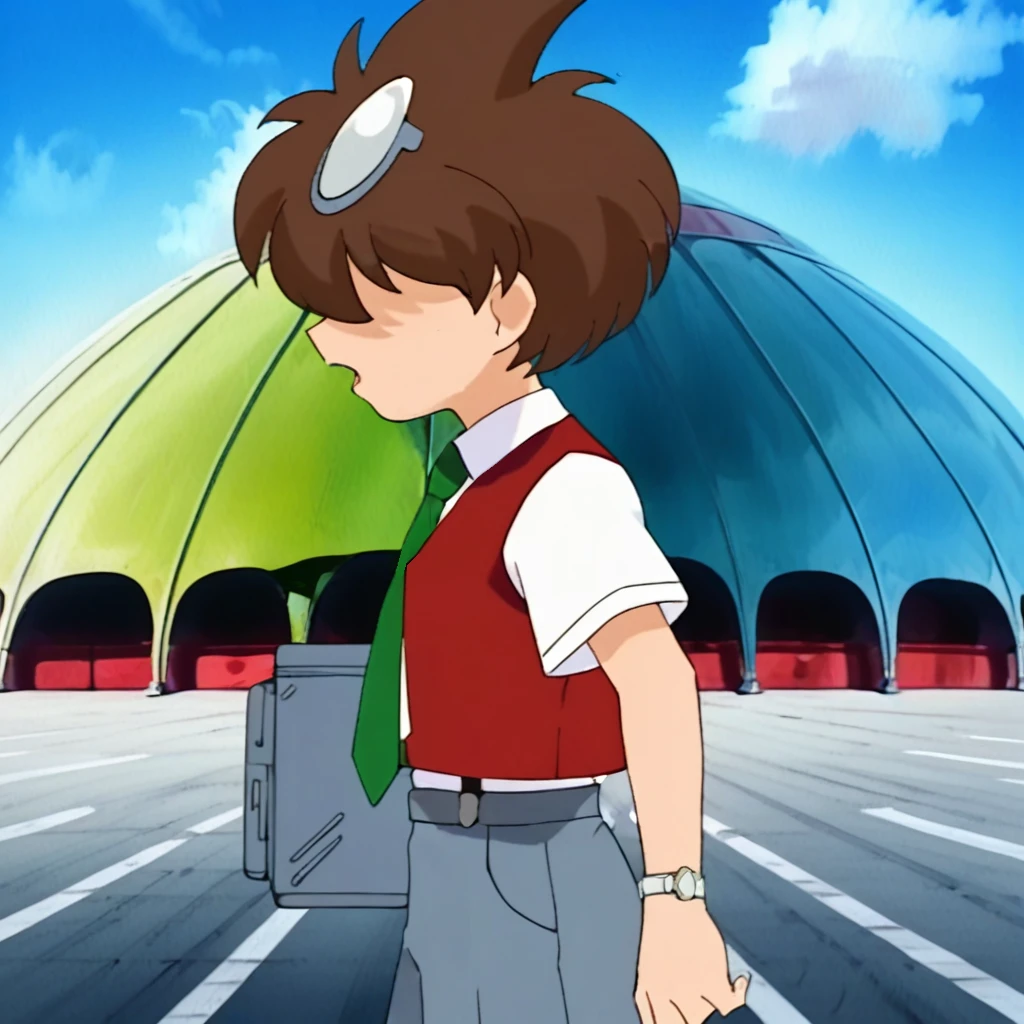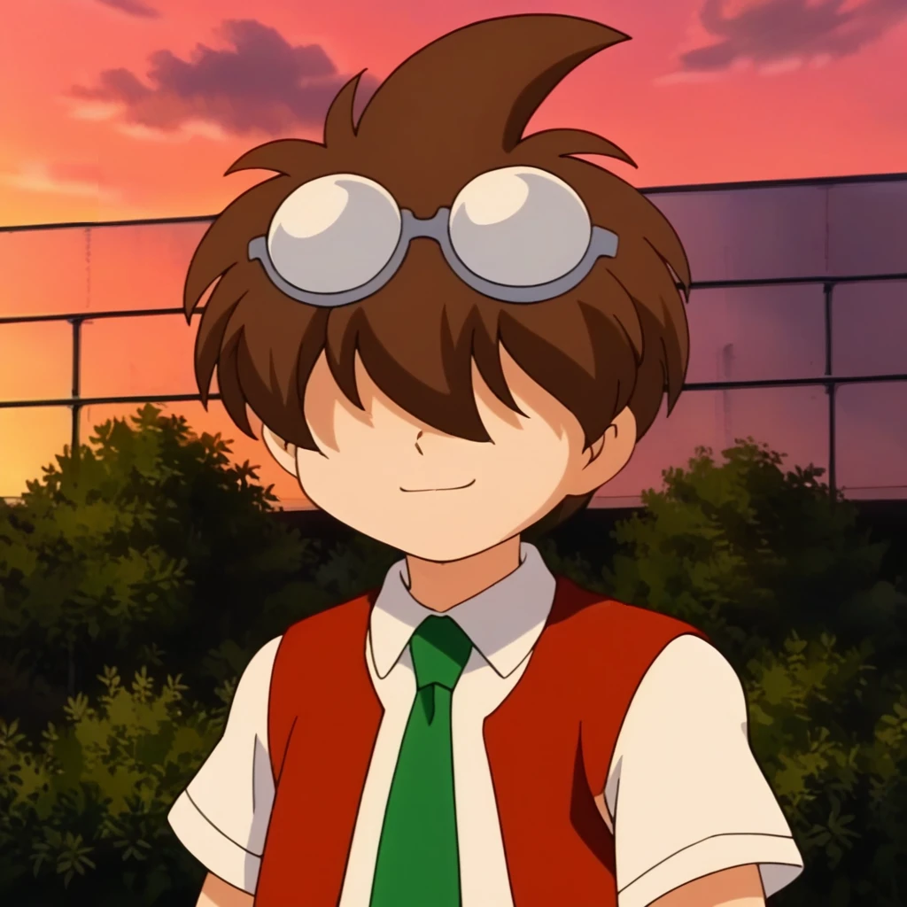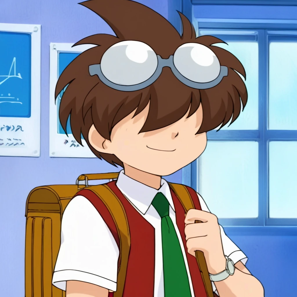 Prompts: male, brown hair, goggles, goggles on head, hair over eyes, brown vest, white collared shirt, short sleeves, green necktie, watch on left wrist, grey shorts, suspenders, socks, black loafers