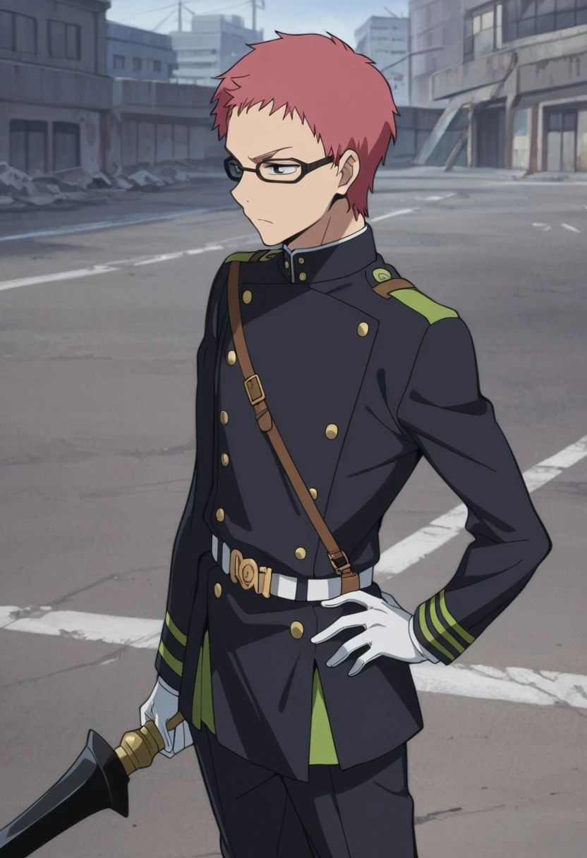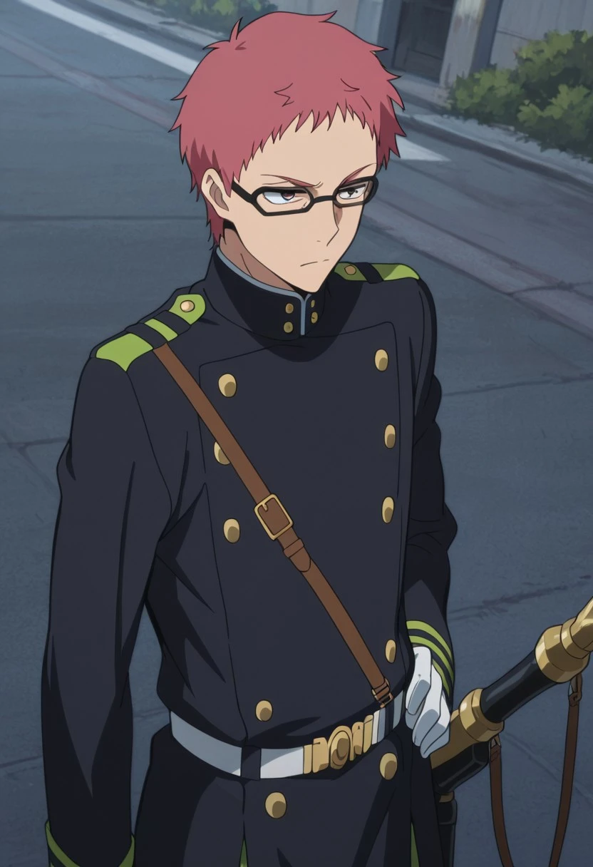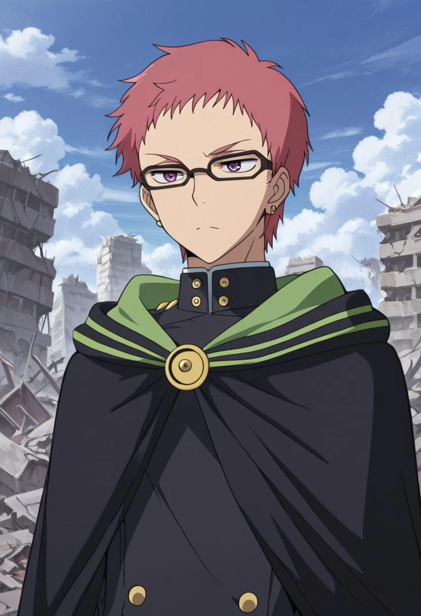 1boy, male focus, solo, purple eyes, glasses, pink hair, forehead, uniform, black jacket, belt, white gloves, black pants, knee boots, black footwear, black cape, hood,