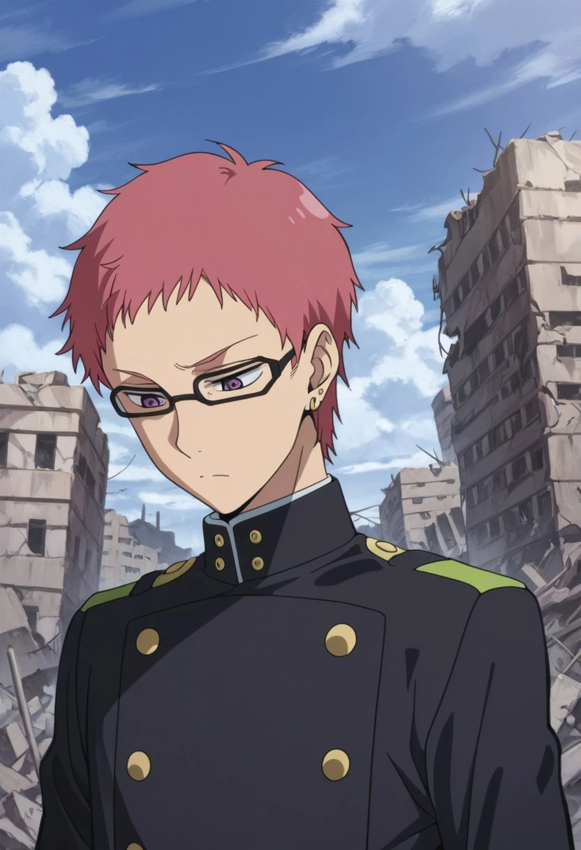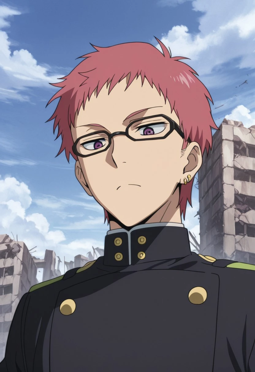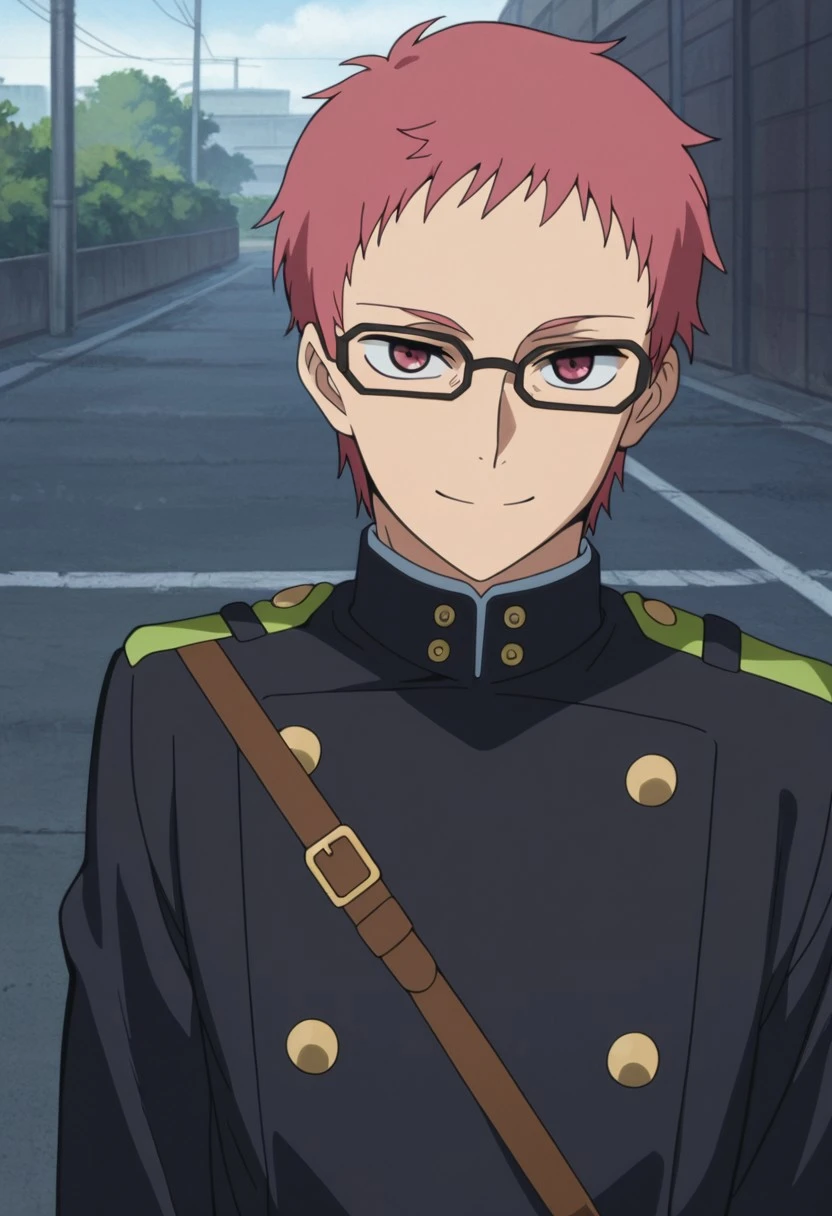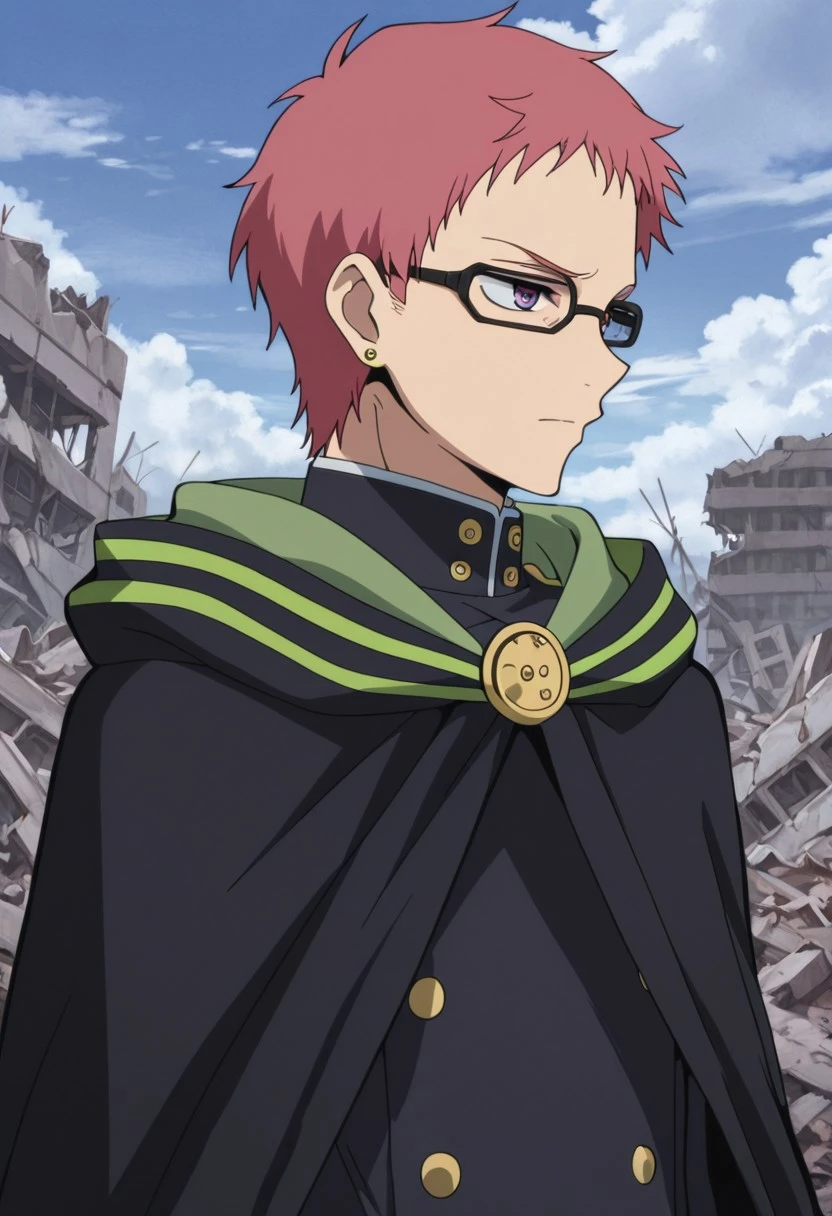 1boy, male focus, solo, purple eyes, glasses, pink hair, forehead, uniform, black jacket, belt, white gloves, black pants, knee boots, black footwear, black cape, hood,