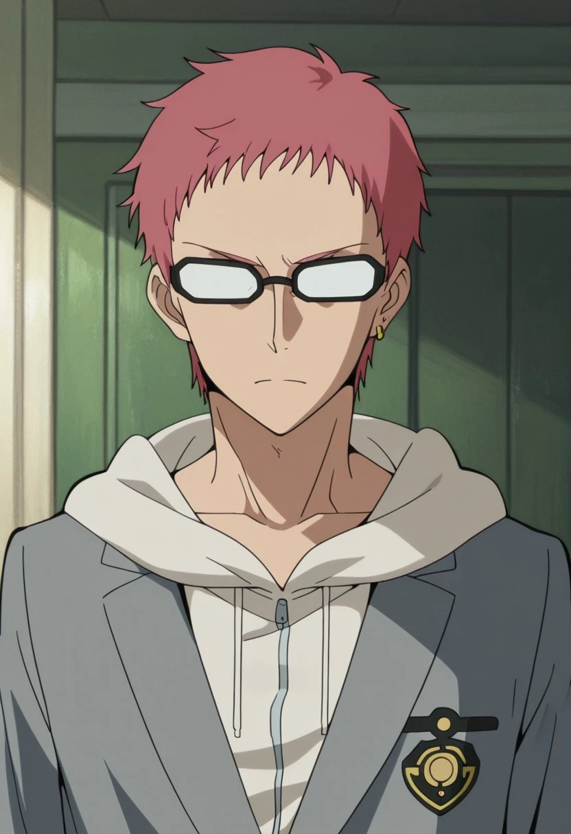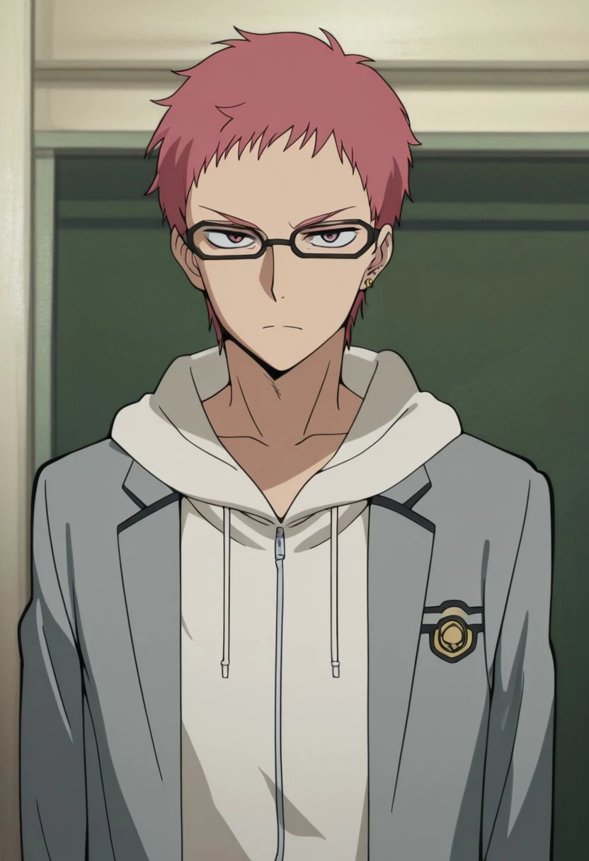 1boy, male focus, solo, purple eyes, glasses, pink hair, forehead, school uniform, white hoodie, hood, grey jacket, open jacket, grey pants,