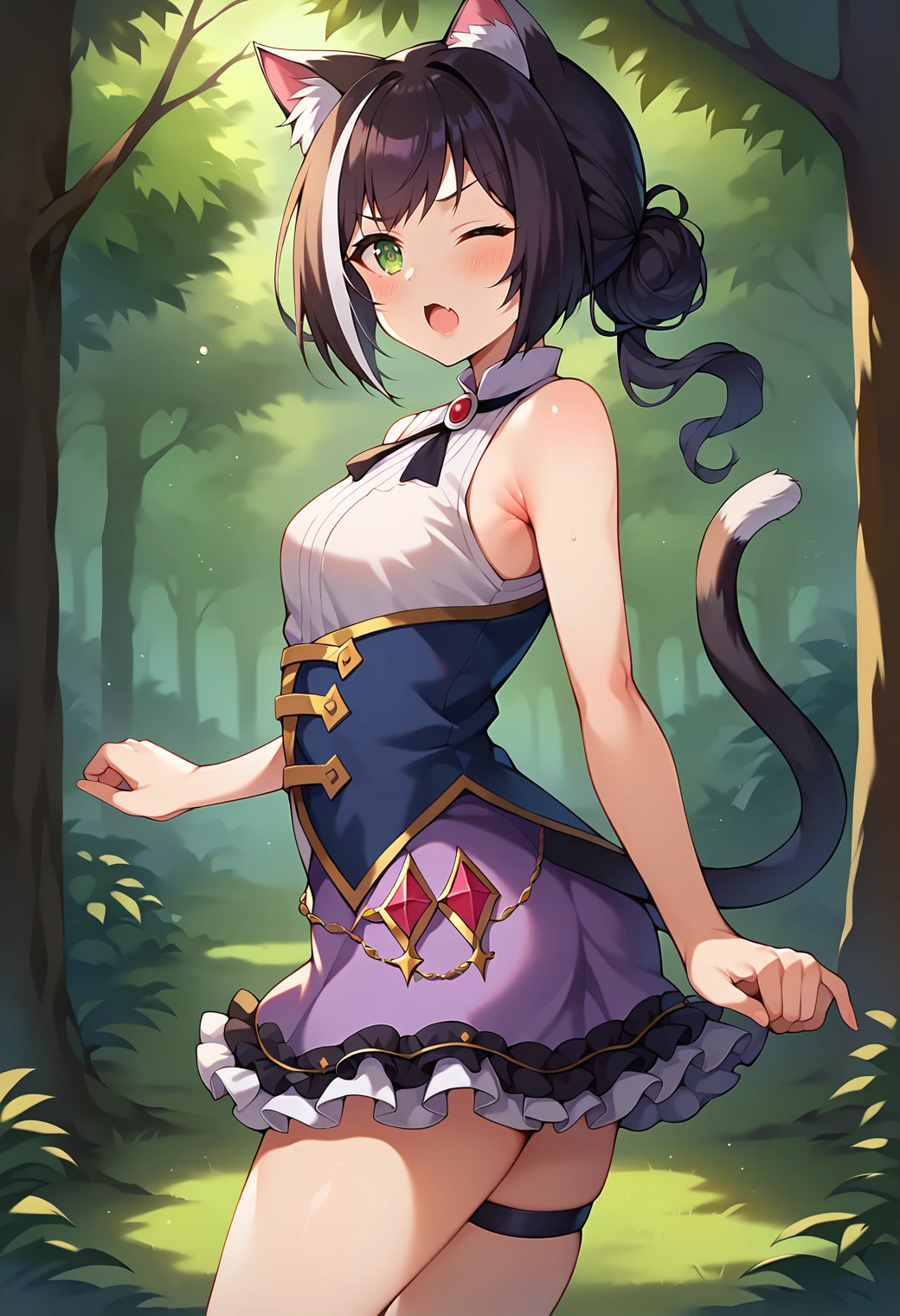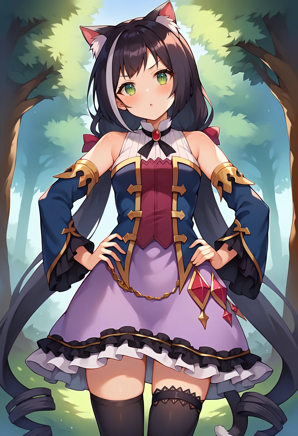 kyarubase, streaked hair, cat ears, animal ear fluff, low twintails, cat tail, caldef, hair bow, blue bodice, sleeveless, white shirt, blue detached sleeves, purple skirt, frilled skirt, thigh strap, black thighhighs, boots, high heels,