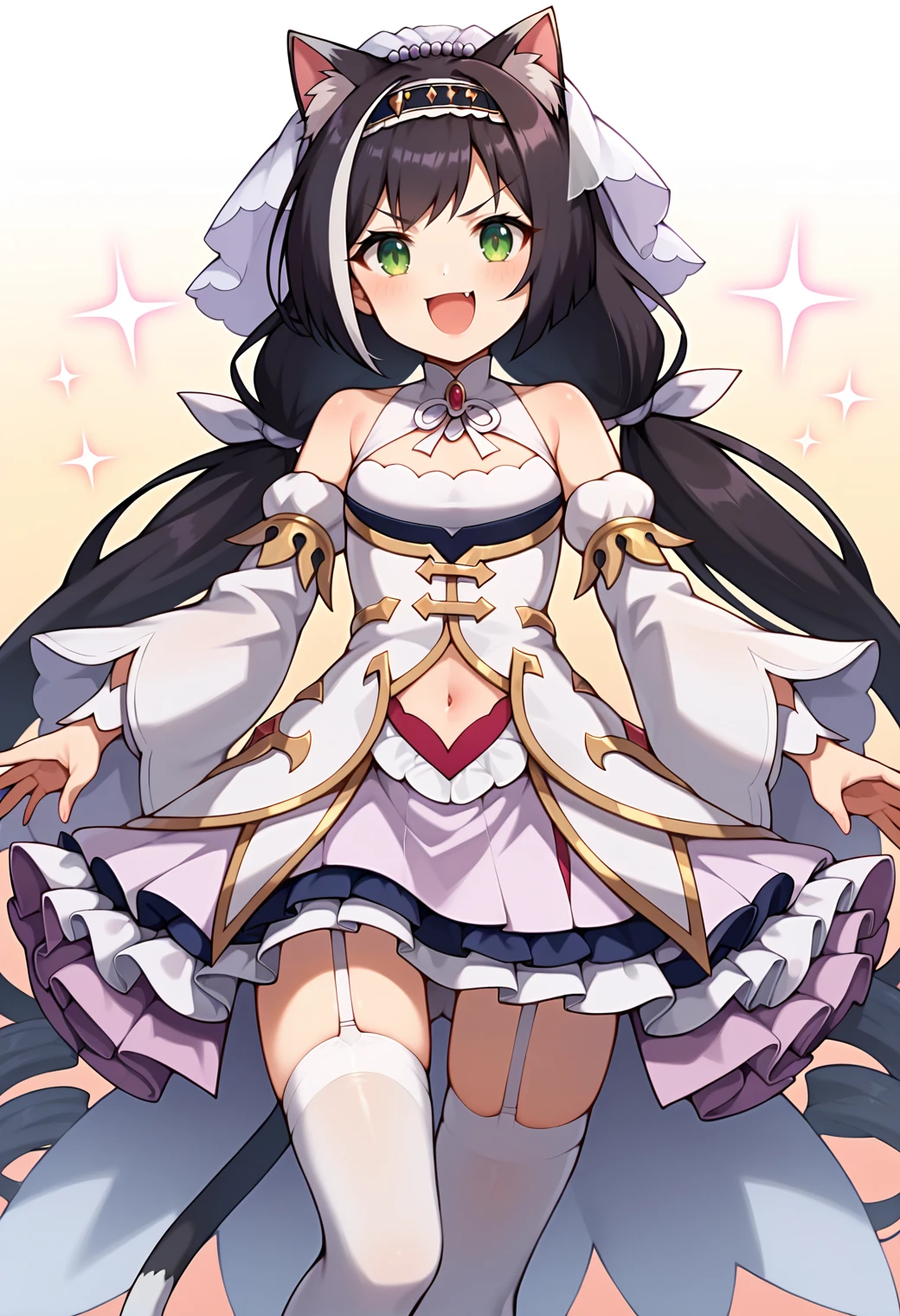 kyarubase, streaked hair, cat ears, animal ear fluff, low twintails, cat tail, calprif, veil, hairband, hair ribbon, white dress, sleeveless, white bowtie, navel cutout, white detached sleeves, wide sleeves, light purple skirt, white thighhighs, garter belt,