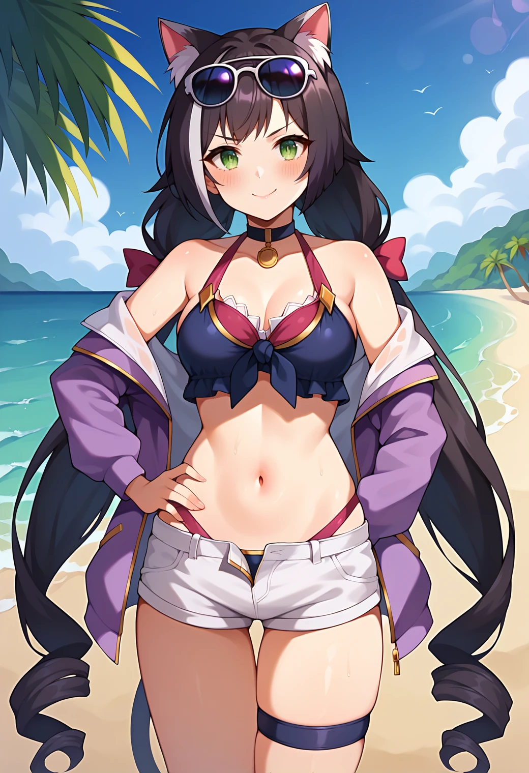 kyarubase, streaked hair, cat ears, animal ear fluff, low twintails, cat tail, calswimsuit, hair bow, eyewear on head, sunglasses, black bikini, purple jacket, off shoulder, white shorts, short shorts, open shorts, thigh strap, sandals,