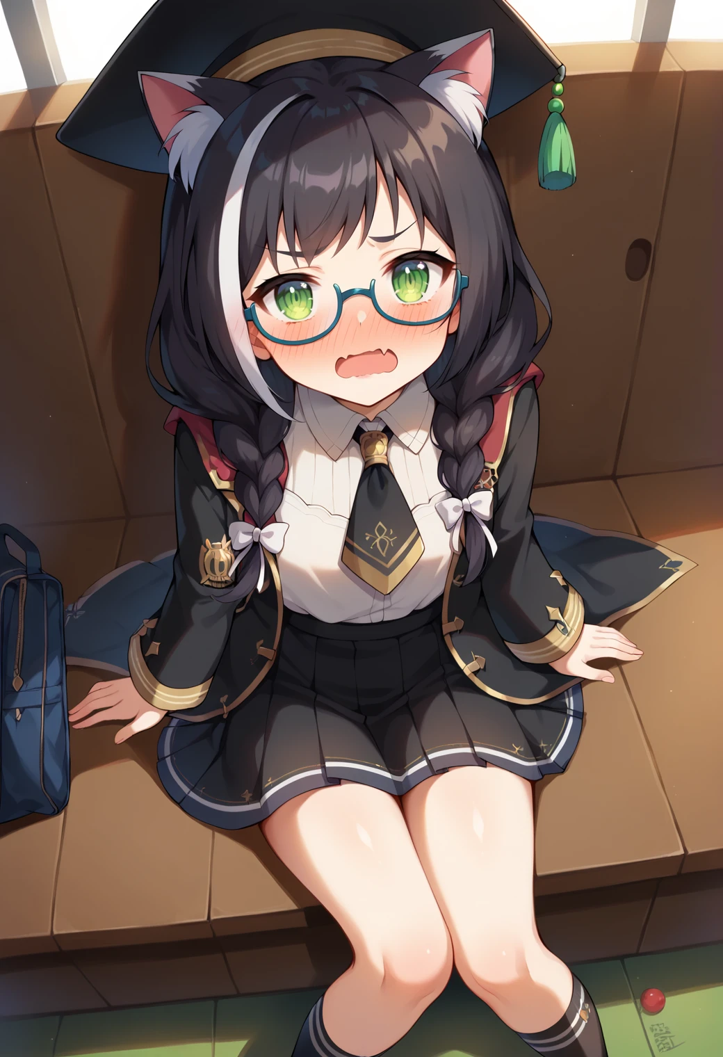 kyarubase, streaked hair, cat ears, animal ear fluff, low twintails, cat tail, calstudent, twin braids, hair ribbon, hat, glasses, white shirt, necktie, black skirt, pleated skirt, black coat, thighs, black socks, shoes,
