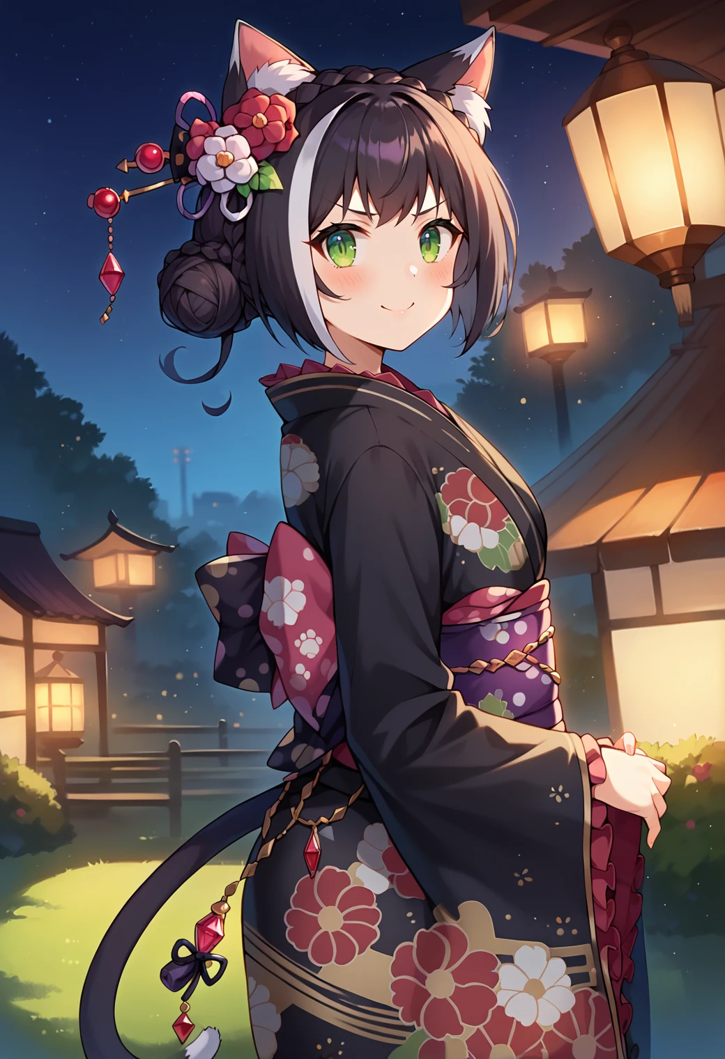 kyarubase, streaked hair, cat ears, animal ear fluff, low twintails, cat tail, calny, hair flower, red flower, white flower, single hair bun, crown braid, black kimono, print kimono, frilled kimono, gem, paw printed obi, floral print, purple obi, long sleeves, tail ribbon,