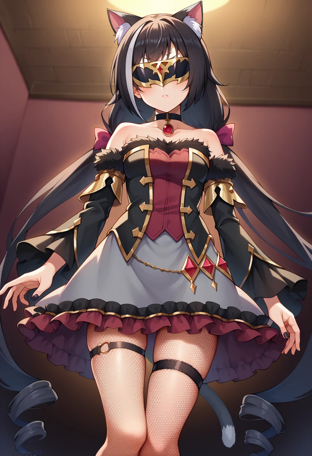 kyarubase, streaked hair, cat ears, animal ear fluff, low twintails, cat tail, calundl, hair bow, eye mask, black choker, black bodice, strapless, fur trim, black detached sleeves, grey skirt, frilled skirt, thigh strap, fishnet pantyhose, black nails, boots, high heels,