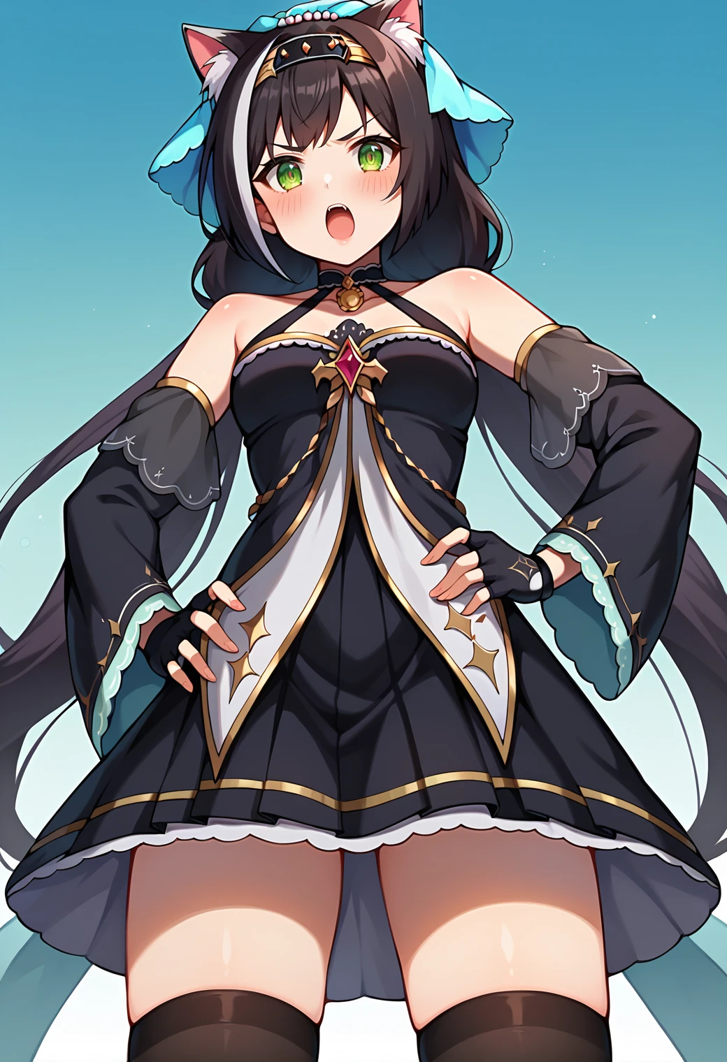 kyarubase, streaked hair, cat ears, animal ear fluff, low twintails, cat tail, calover, hairband, blue veil, black choker, black dress, black skirt, sleeveless dress, halterneck, bare shoulders, wide sleeves, black detached sleeeves, fingerless gloves, black thighhighs,