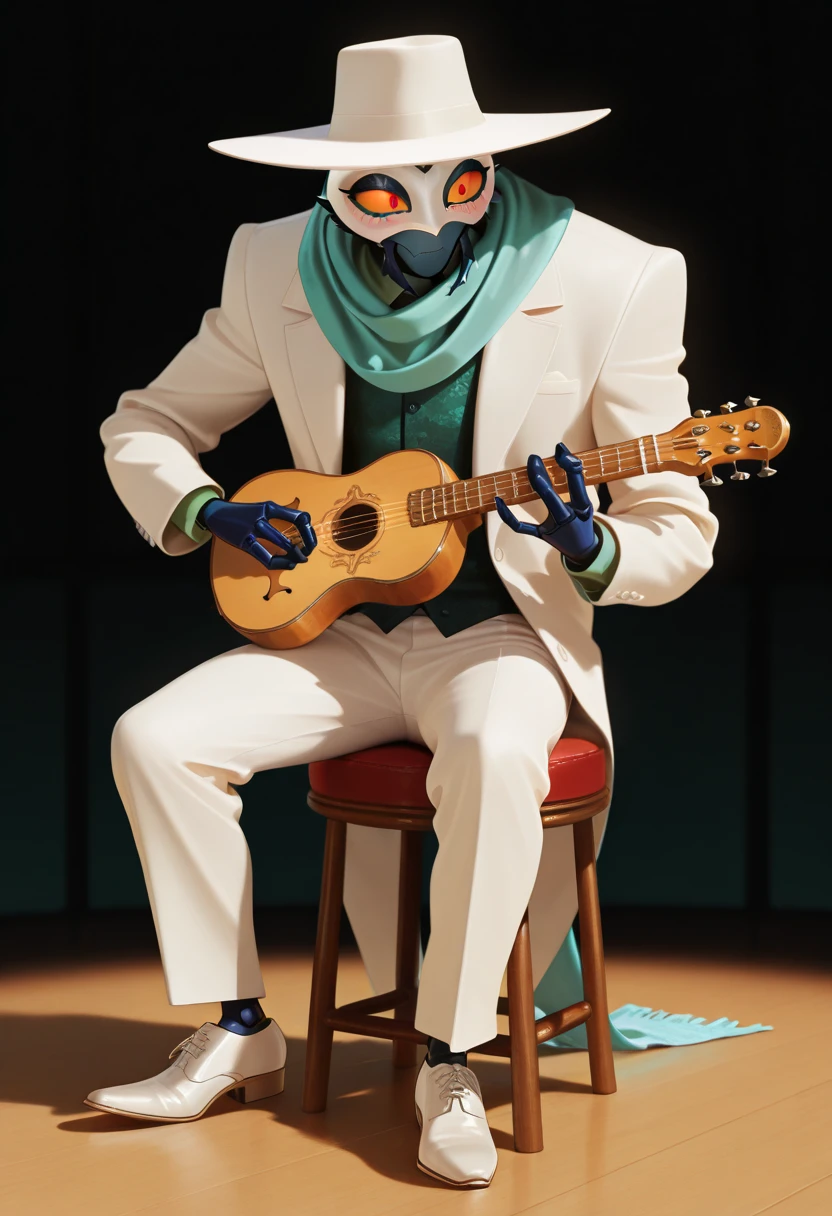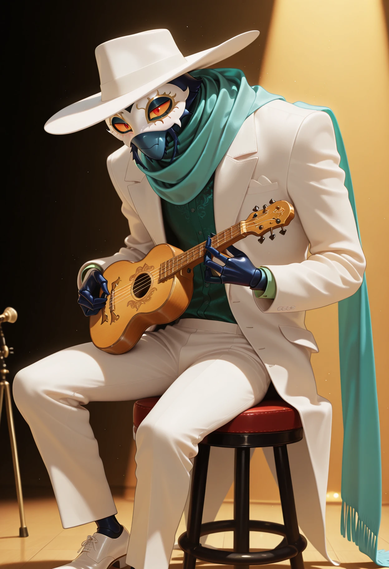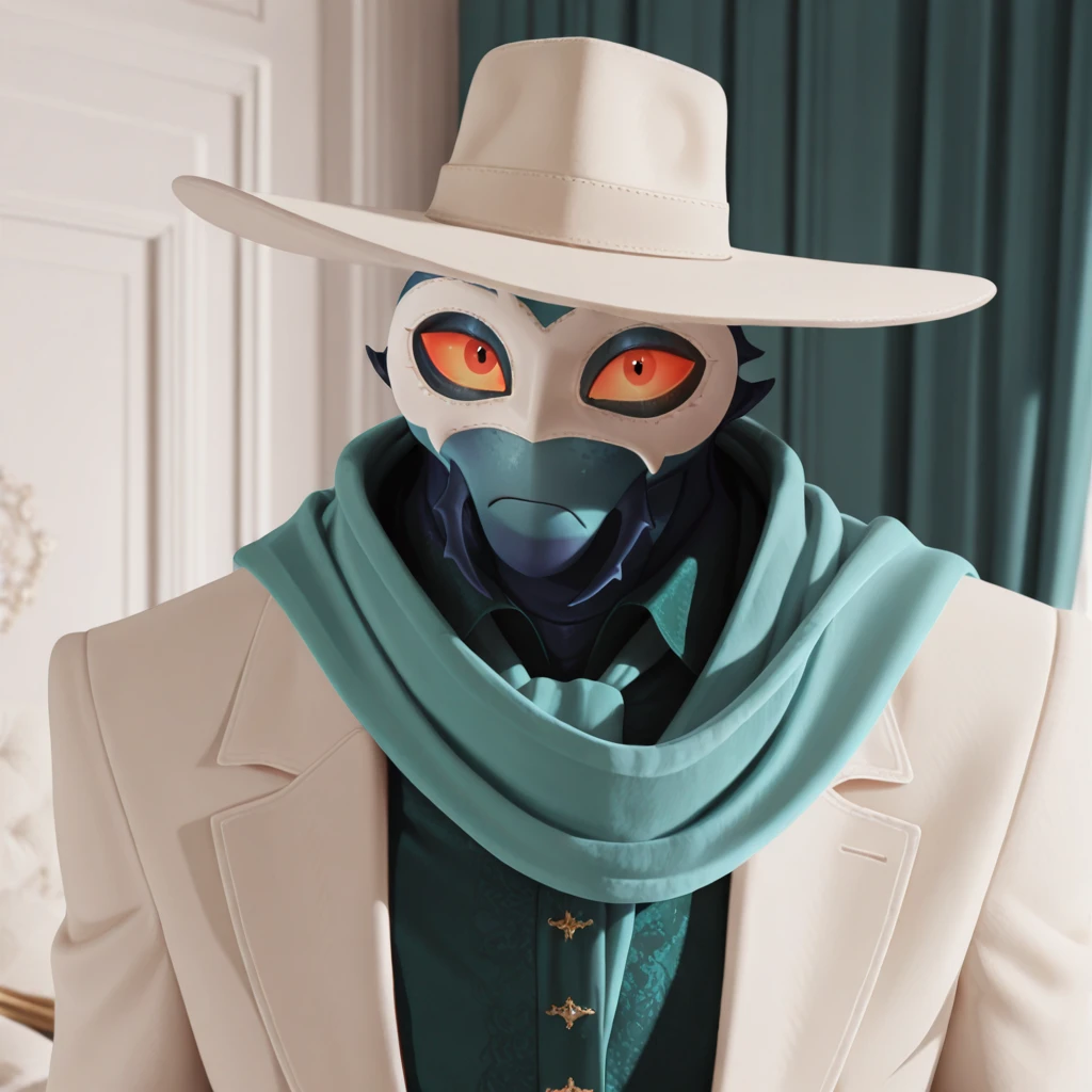white formal suit, green shirt, teal scarf, white masquerade mask