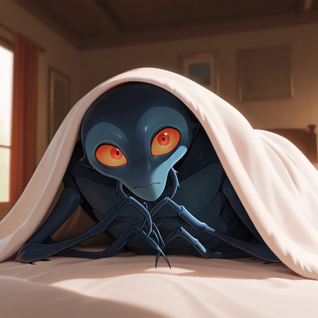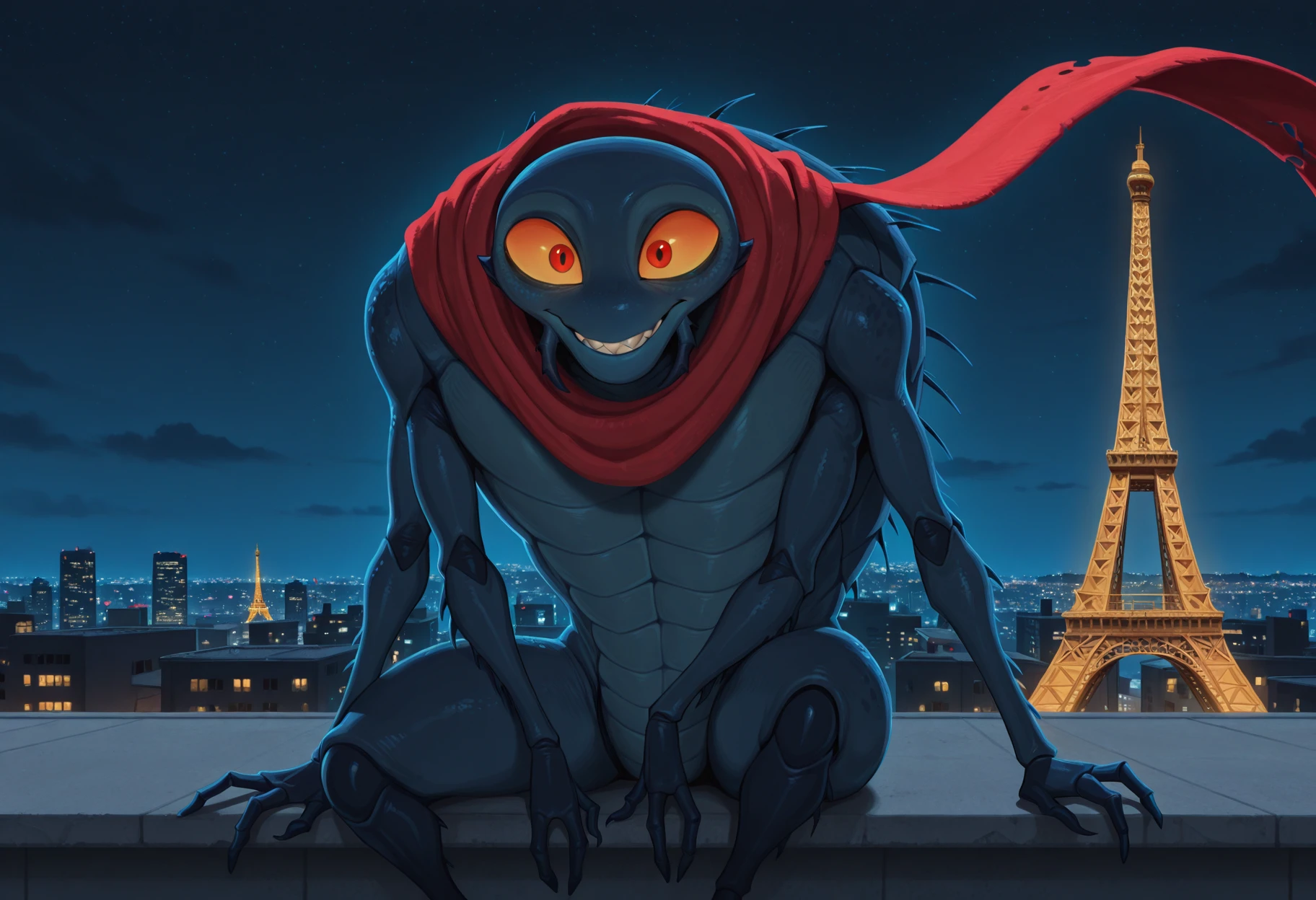 étiquettes: arthropod, flea, insect, no humans, monster, colored skin, 4 arms, teeth, red eyes, yellow sclera