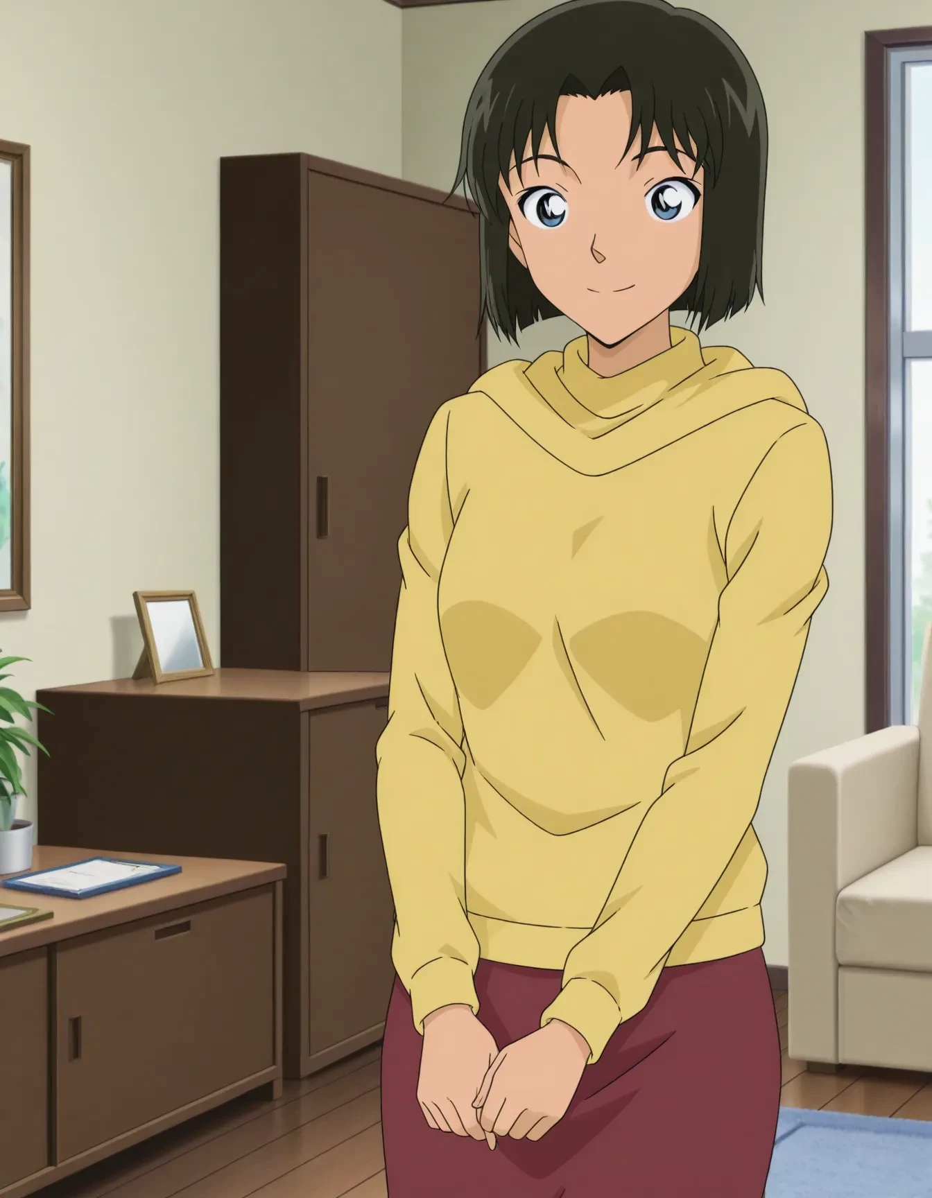 yellow hoodie,sweater,long sleeves,red skirt,brown skirt,pencil skirt,white socks,pink slippers,