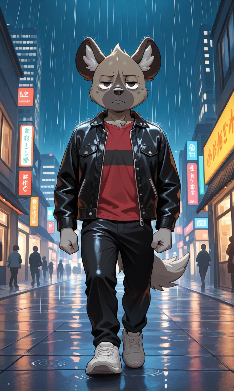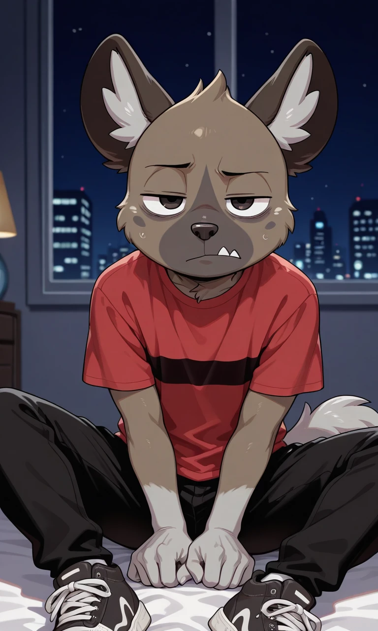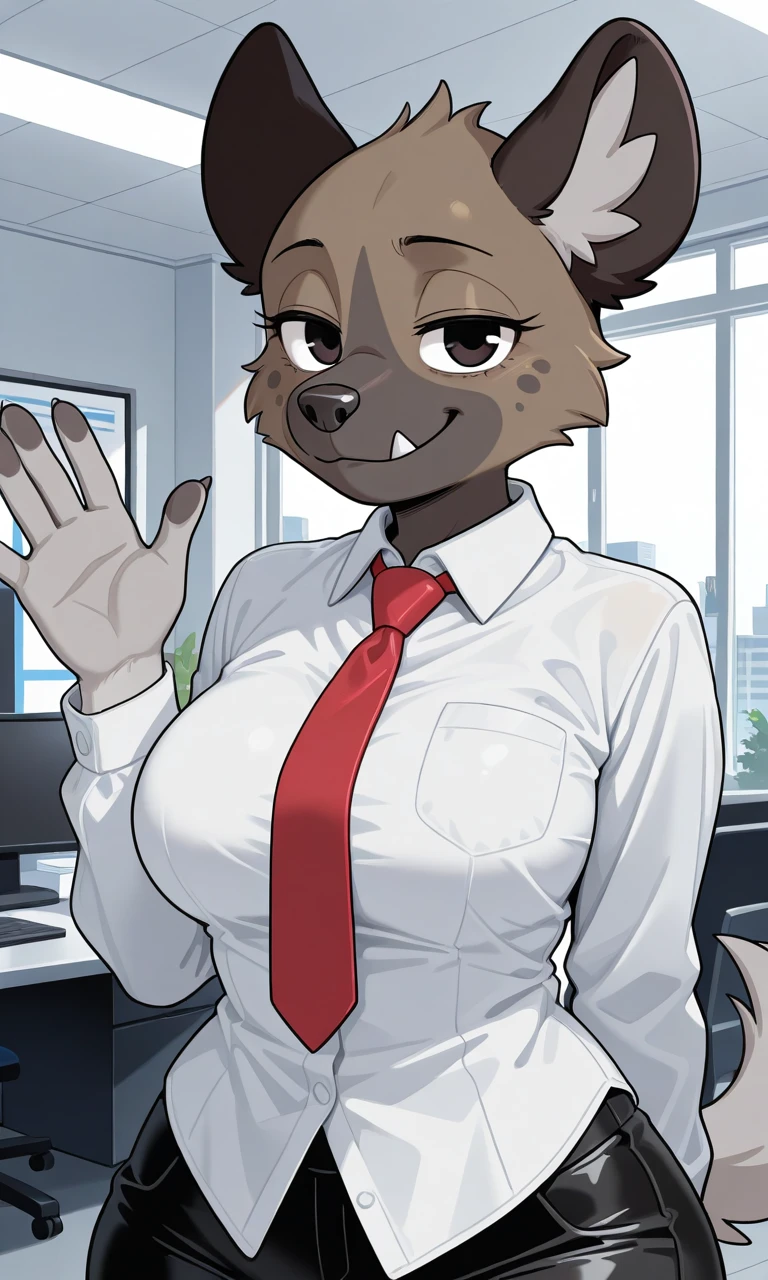 Haida_(Aggretsuko), anthro hyena, gray-brown fur, Two-tone fur, black eyes