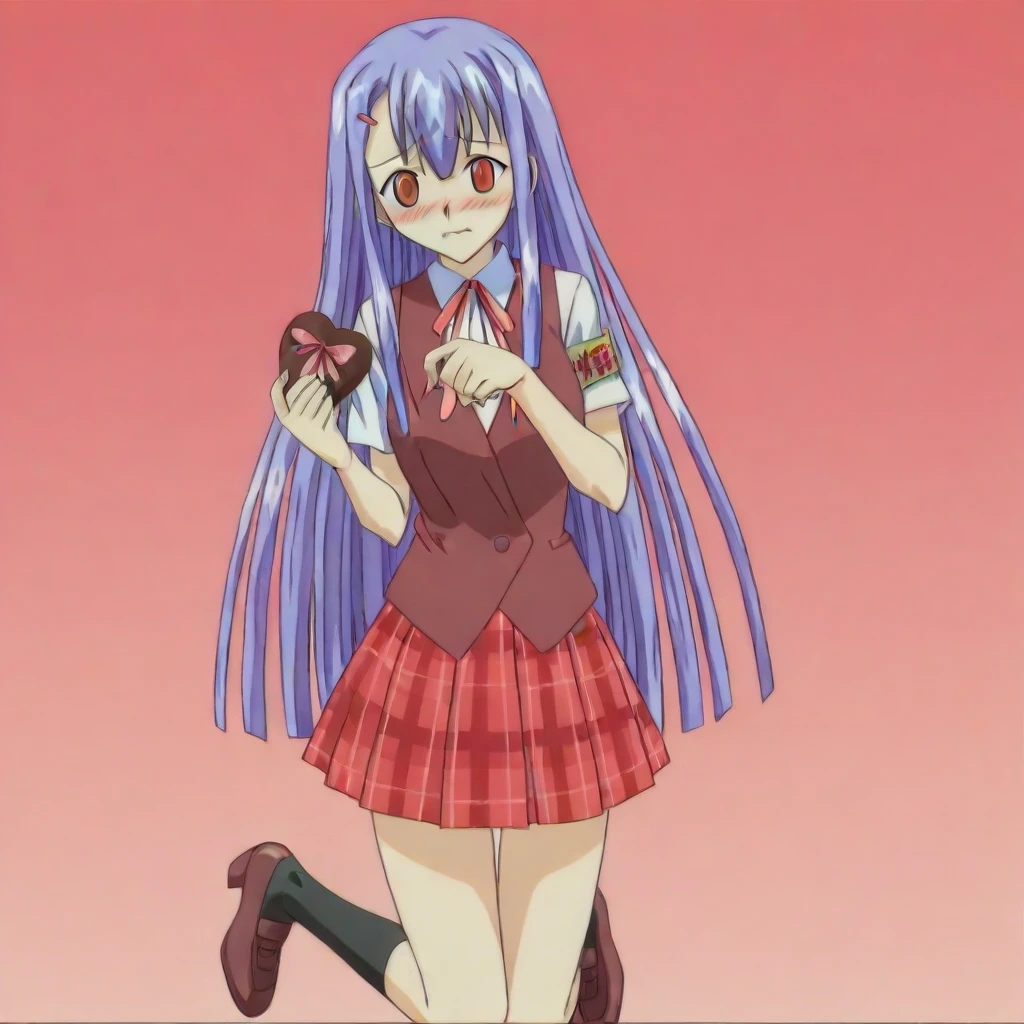 misa kakizaki \(negima\), purple hair, long hair, sidelocks, hairclip, red eyes, collar, ribbons, red vest, school uniform, white undershirt, red skirt, socks, heels, large breasts, 1girl, solo